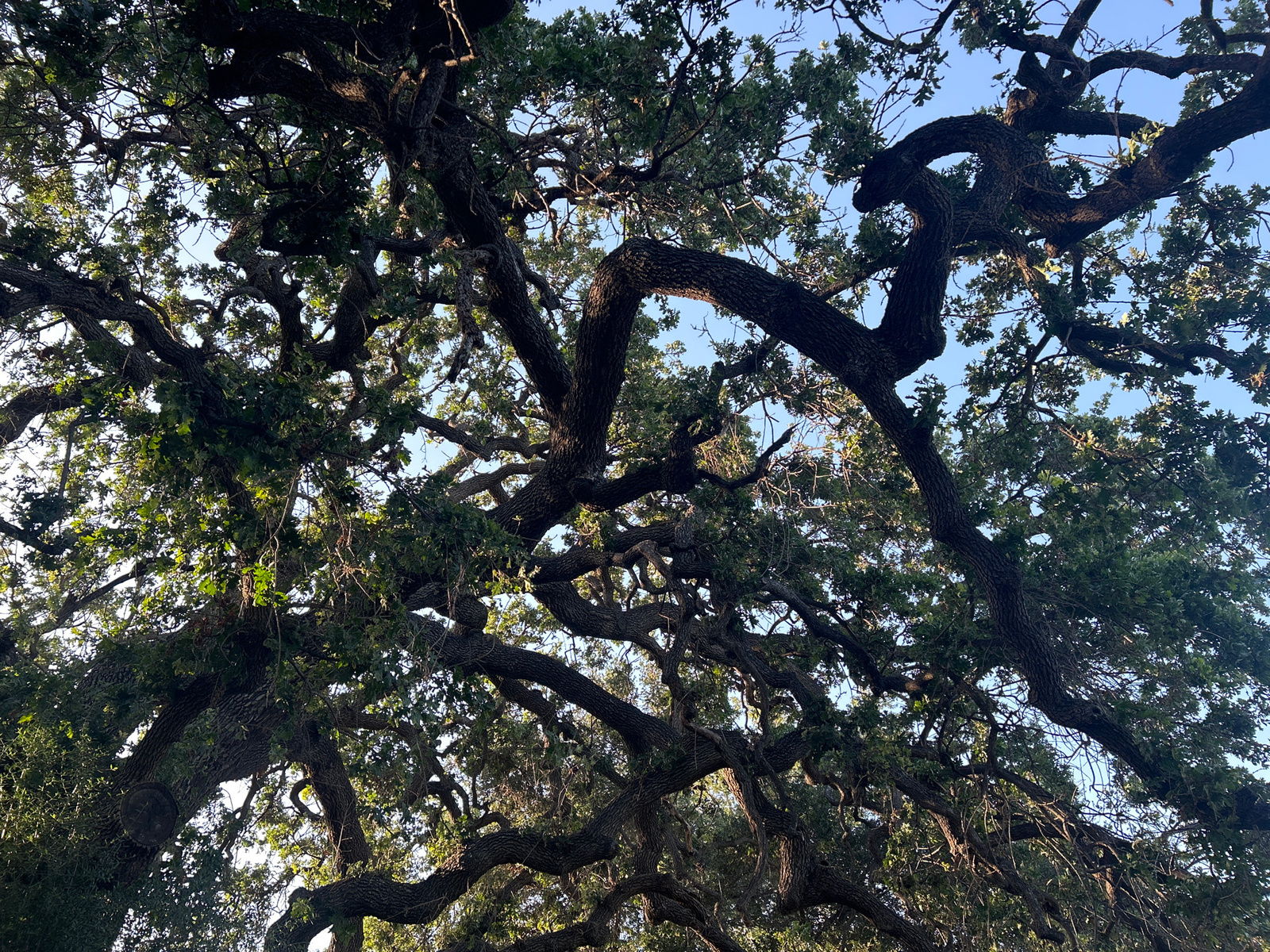 The image shows a dense network of tree branches and leaves against a backdrop of a blue sky. The branches are thick and gnarled, suggesting an old tree. The leaves are green, with some areas appearin…read more
