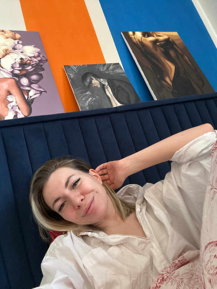 An indoor scene in the city of Khimki, Russia, depicts a woman resting on her left side in the foreground, facing the viewer. She has light-colored hair and a slight smile, with her left hand positioned behind her left ear. She is wearing a light-colored, long-sleeved collared shirt and patterned lower garments with a reddish-brown, intricate design. The woman is positioned against a dark blue, vertically tufted headboard or sofa back. Above this padded surface, leaning against a wall painted with vertical stripes of white, orange, and blue, are three artworks. From left to right: a canvas featuring a hand holding light-colored floral blossoms on a lavender background; a central darker canvas depicting a figure with dark hair and a pale complexion looking downwards, against a textured grey background; and a rightmost canvas displaying an abstract or stylized human form in brown and beige tones. | Open Wire