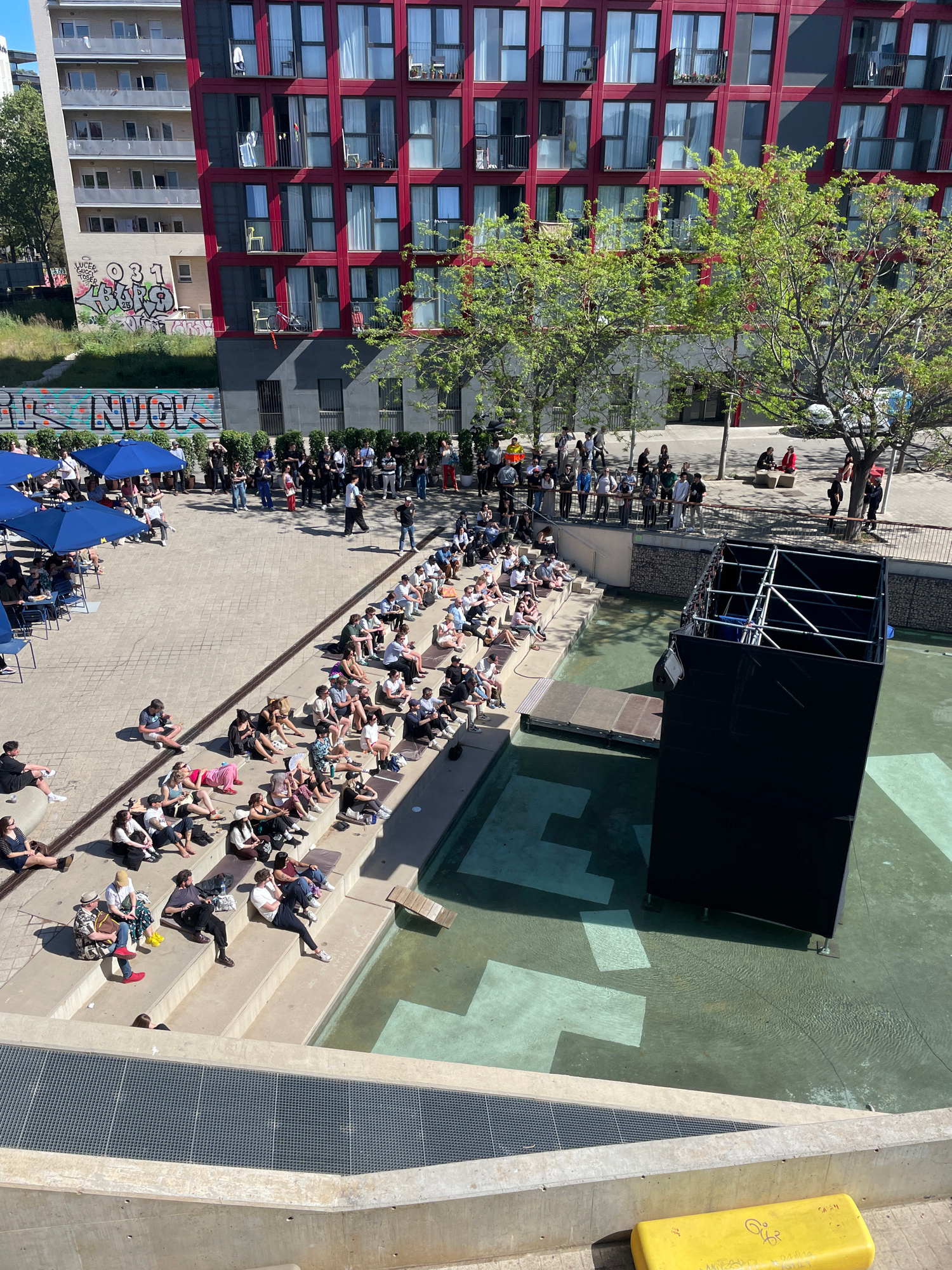 The image captures a high-angle view of an outdoor event in Barcelona, Spain. A crowd of people is seated on tiered concrete steps facing a stage structure partially submerged in a shallow pool. The s…read more