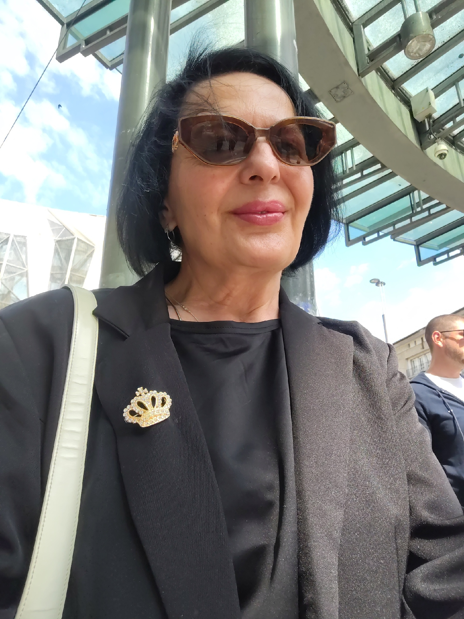 The image shows a woman wearing sunglasses and a black blazer with a gold crown brooch, standing near a modern metal and glass structure. She has short black hair and is wearing a light-colored bag ov…read more