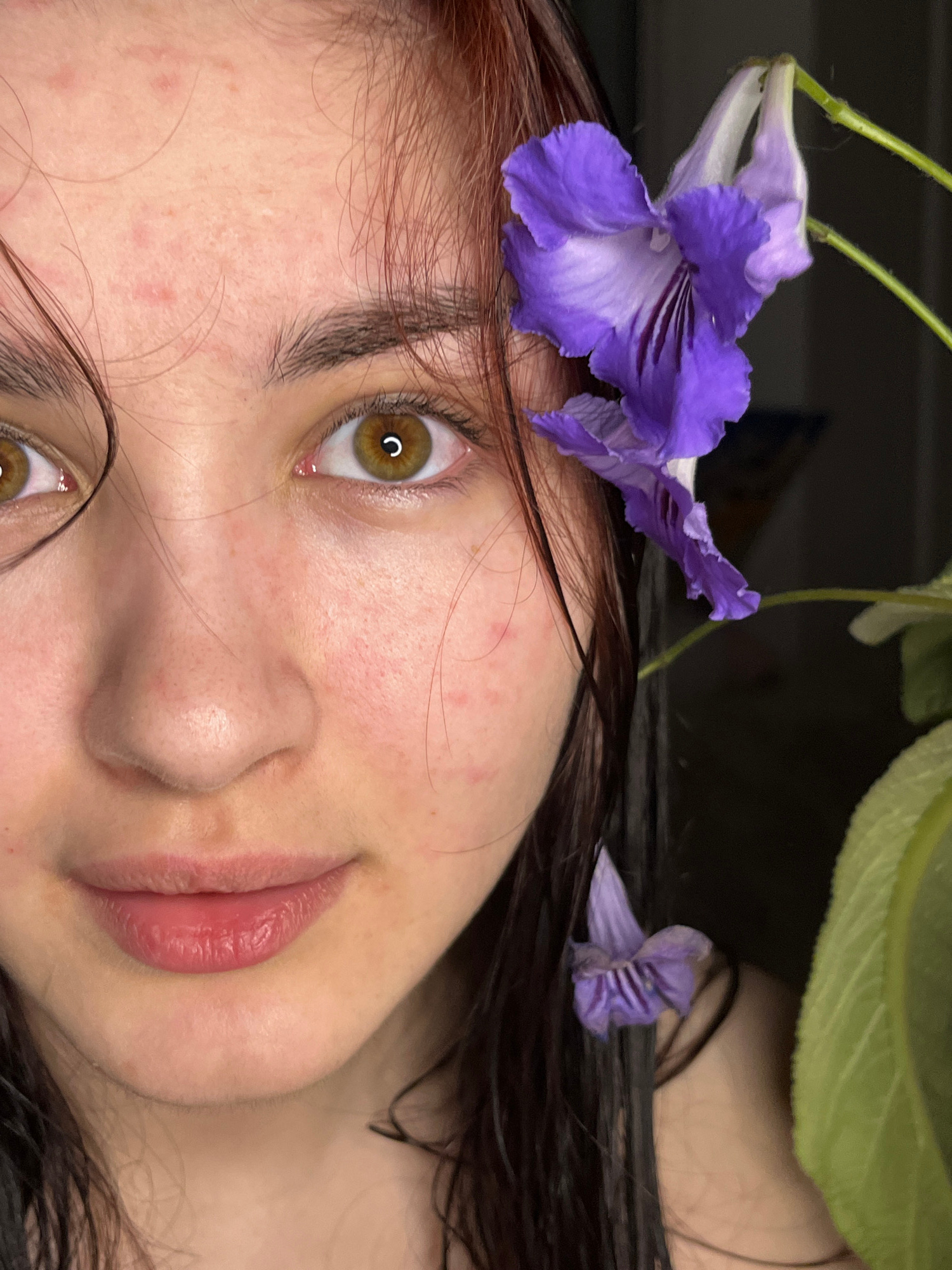 A close-up, angled shot of a person's face adorned with purple flowers and a green leaf. The individual has fair skin with freckles, brown hair, and amber-colored eyes. One large purple flower rests o…read more
