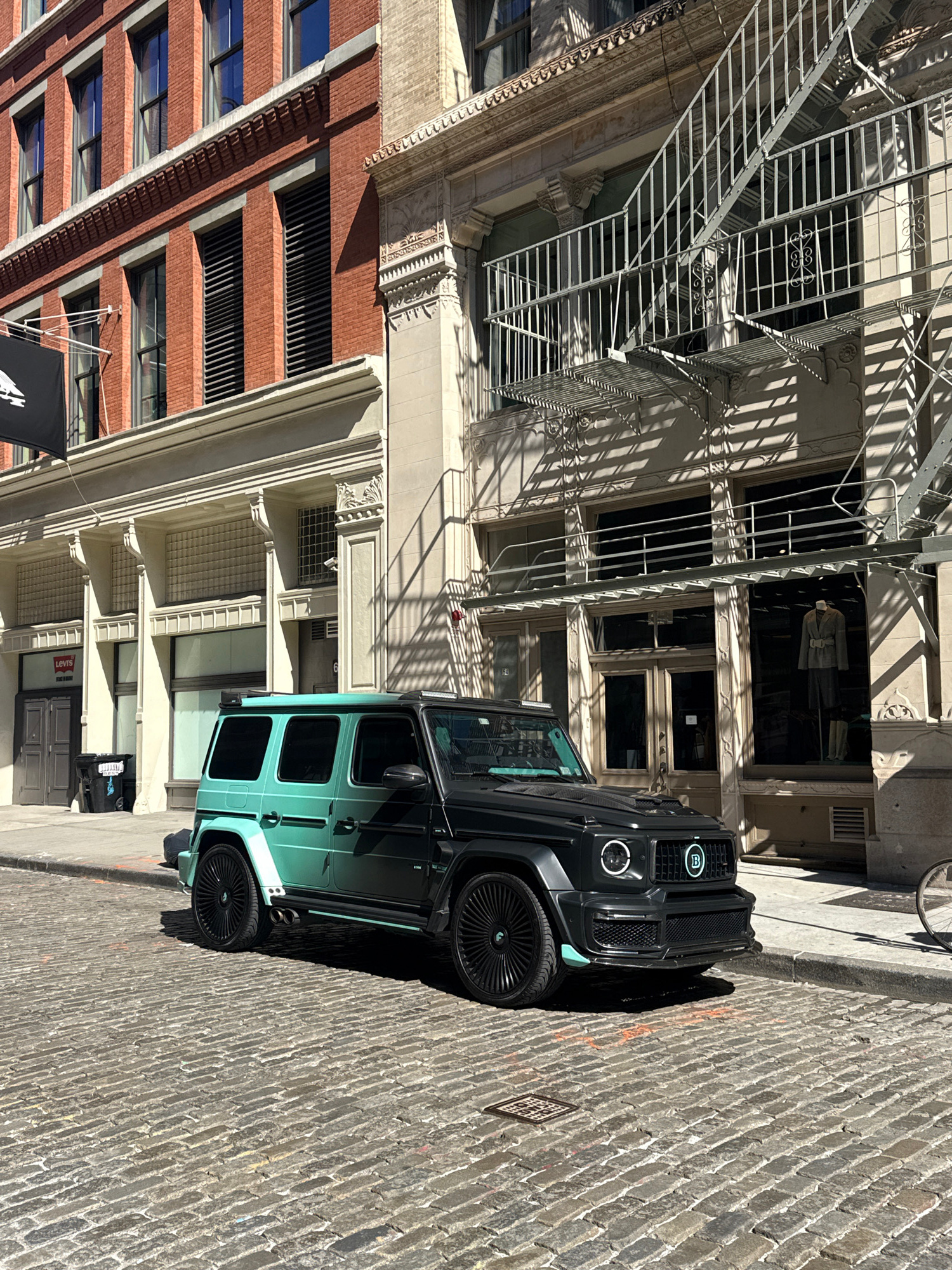 A luxury vehicle is parked on a cobblestone street in a district of New York City, United States. The vehicle is a dark-colored SUV with distinctive styling, including blacked-out wheels and an unusual light green accent on the lower portion of the vehicle, which is an otherwise black vehicle. The vehicle is parked along the curb of a street lined with multi-story buildings with ornate facades. A fire escape is affixed to the exterior of one building. The buildings appear to house both retail and residential spaces. The image is oriented at an unusual angle, with the top of the buildings tilted to the left, suggesting the photograph was taken from an askew perspective. No people are visible. | Open Wire