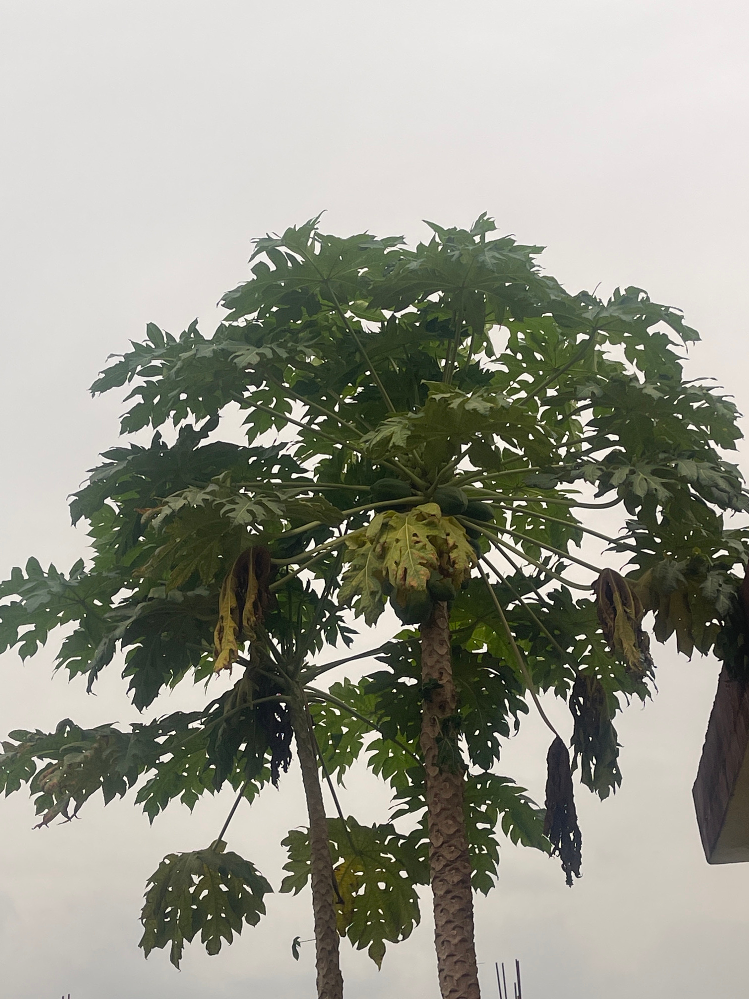 The image shows a papaya tree with green leaves and fruits. The sky is overcast. The location is Abraka, Nigeria.