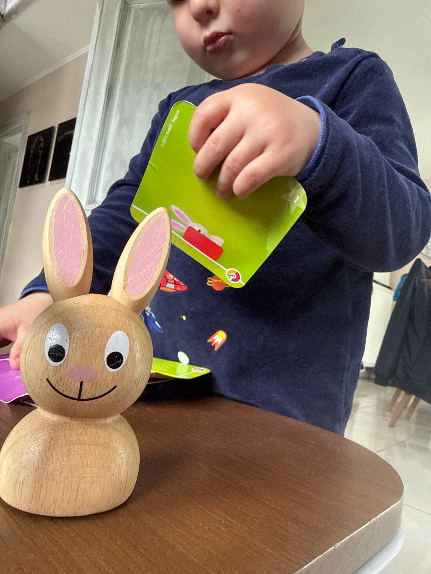 A child is holding a wooden rabbit toy and a green card with an illustration of a red rabbit on it. The child is wearing a navy blue shirt with some colorful rocket ship designs. They are standing nex…read more