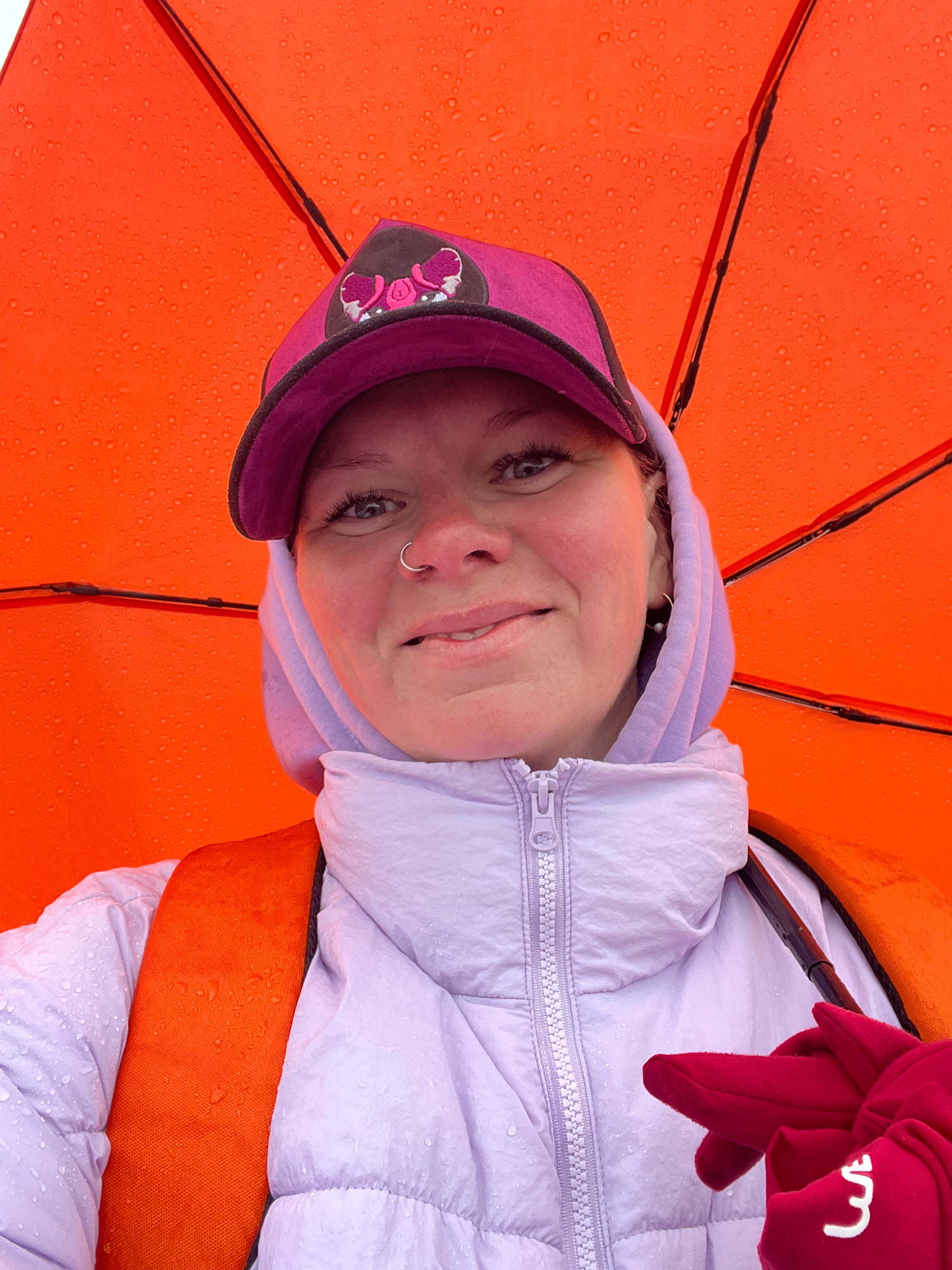 The image is a low-angle shot, looking up at a young person smiling directly at the camera while standing under a bright orange umbrella. The umbrella's canopy is visibly covered in numerous water dro…read more