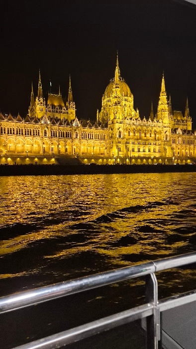 The image displays the Hungarian Parliament Building in Budapest, Hungary, at night, observed from the Danube River. The Parliament Building, characterized by its numerous spires and prominent central…read more
