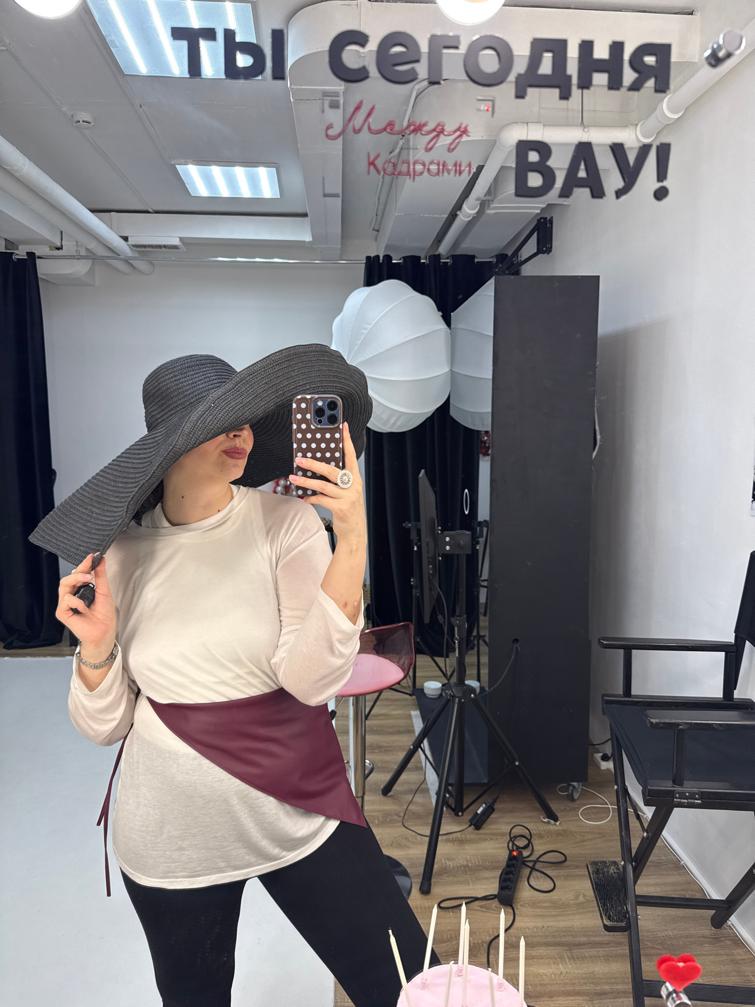A person is taking a selfie in what appears to be a photography studio or a place with photographic equipment. They are wearing a wide-brimmed hat, a light-colored top, and black leggings or pants, an…read more