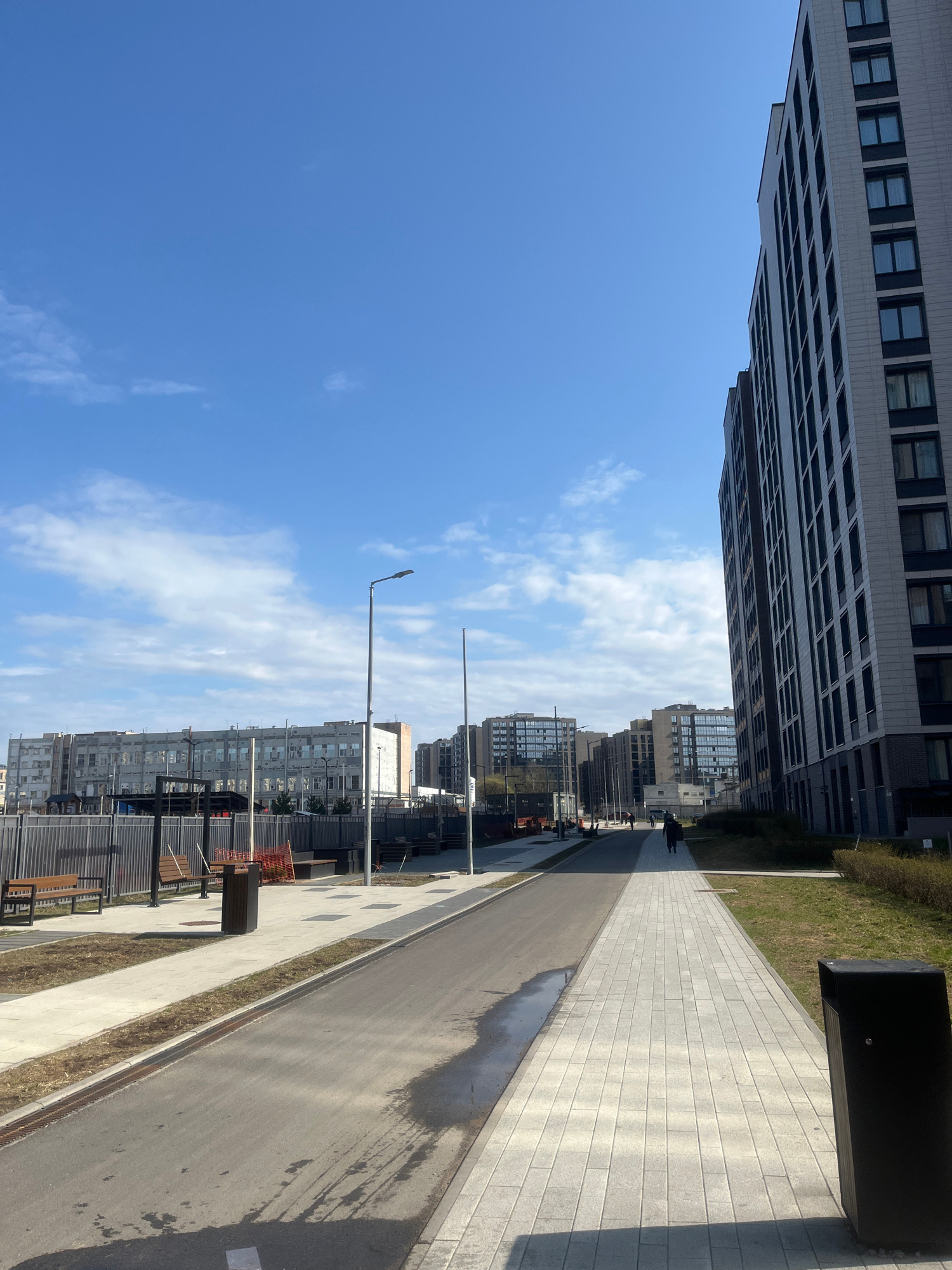 The image captures a street scene in Saint Petersburg, Russia. The view is oriented lengthwise down a pedestrian walkway flanked by modern buildings on both sides. The building on the left is tall and…read more