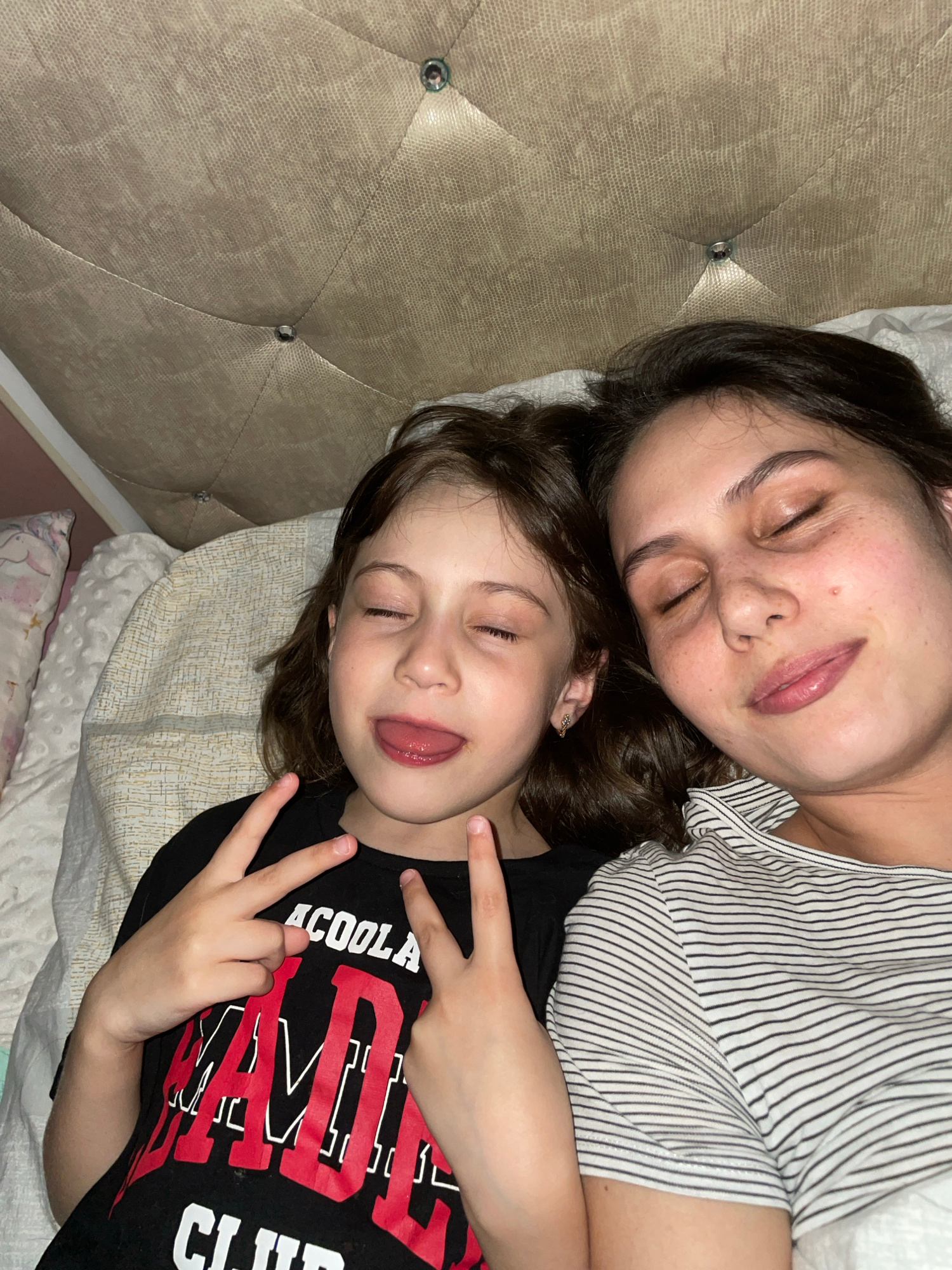 Two individuals, presumably a woman and a young girl, are lying down side-by-side on a bed. Both have their eyes closed. The woman is wearing a striped top. The young girl is wearing a black t-shirt w…read more