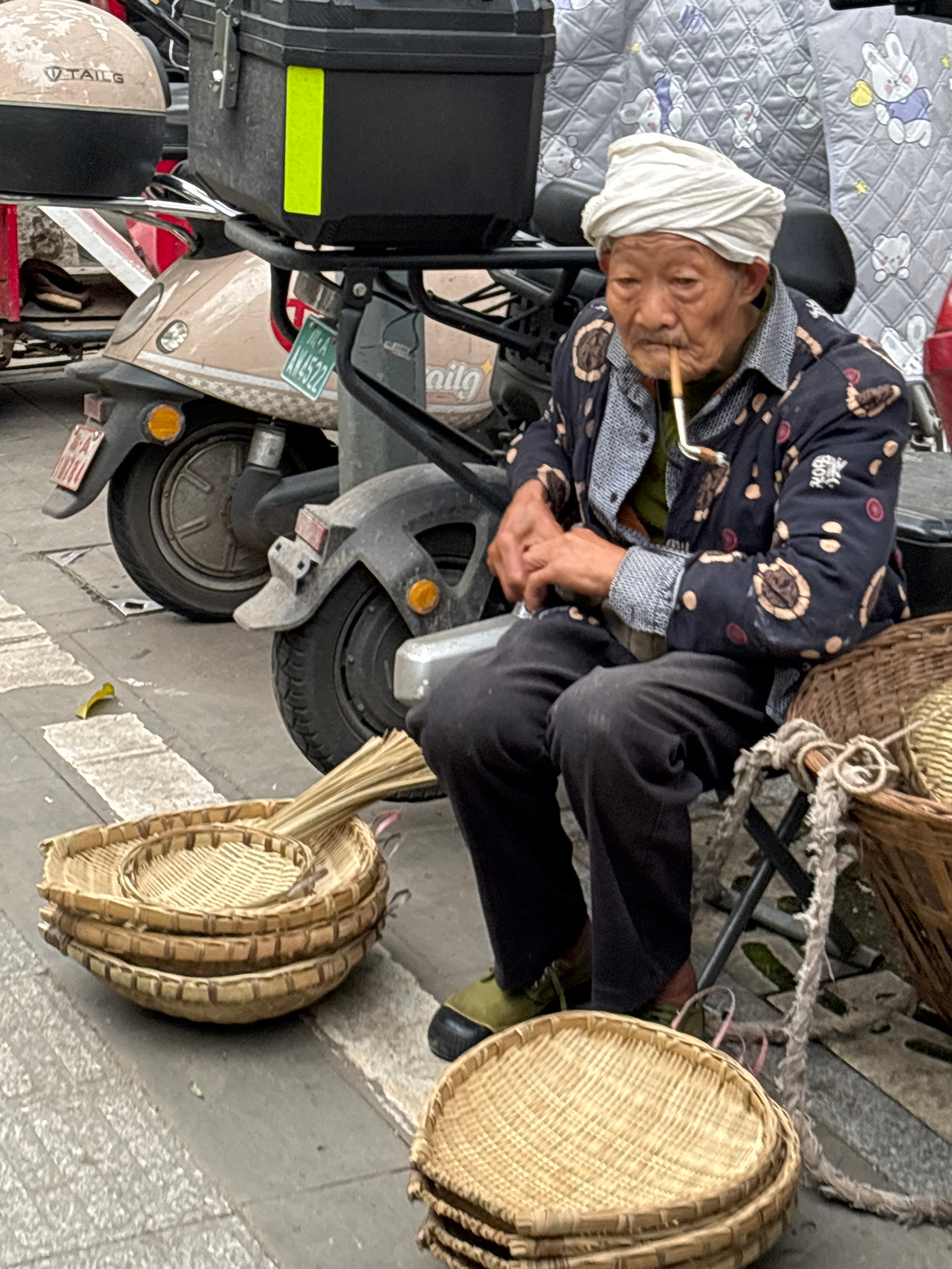 An elderly woman with a white headscarf is sitting on an electric moped on a city street in Jiangjin, China. She is wearing a dark patterned jacket and dark pants. A smoking pipe is held in her mouth.…read more