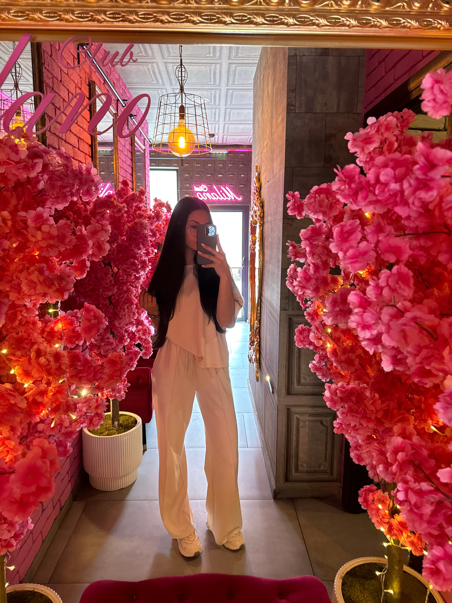 The image displays a young woman taking a selfie in a mirror within a vibrantly decorated indoor space. The woman, with long dark hair, is dressed in a light cream or beige loose-fitting shirt and matβ¦read more
