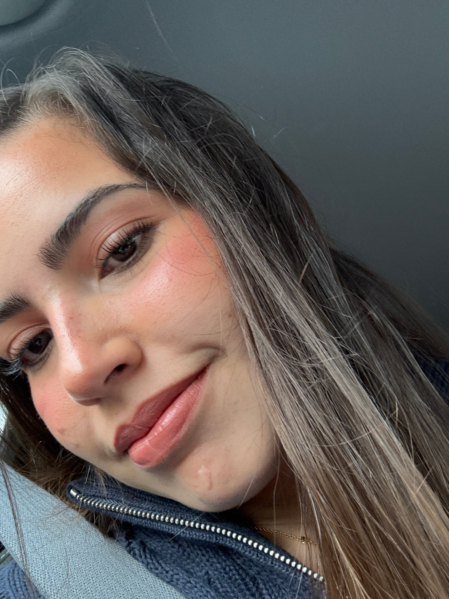 A close-up, tilted shot of a woman with long, light brown hair and fair skin. She has dark eyes with long lashes. She is wearing a blue knit sweater or jacket. A gold necklace is visible at her neck.…read more