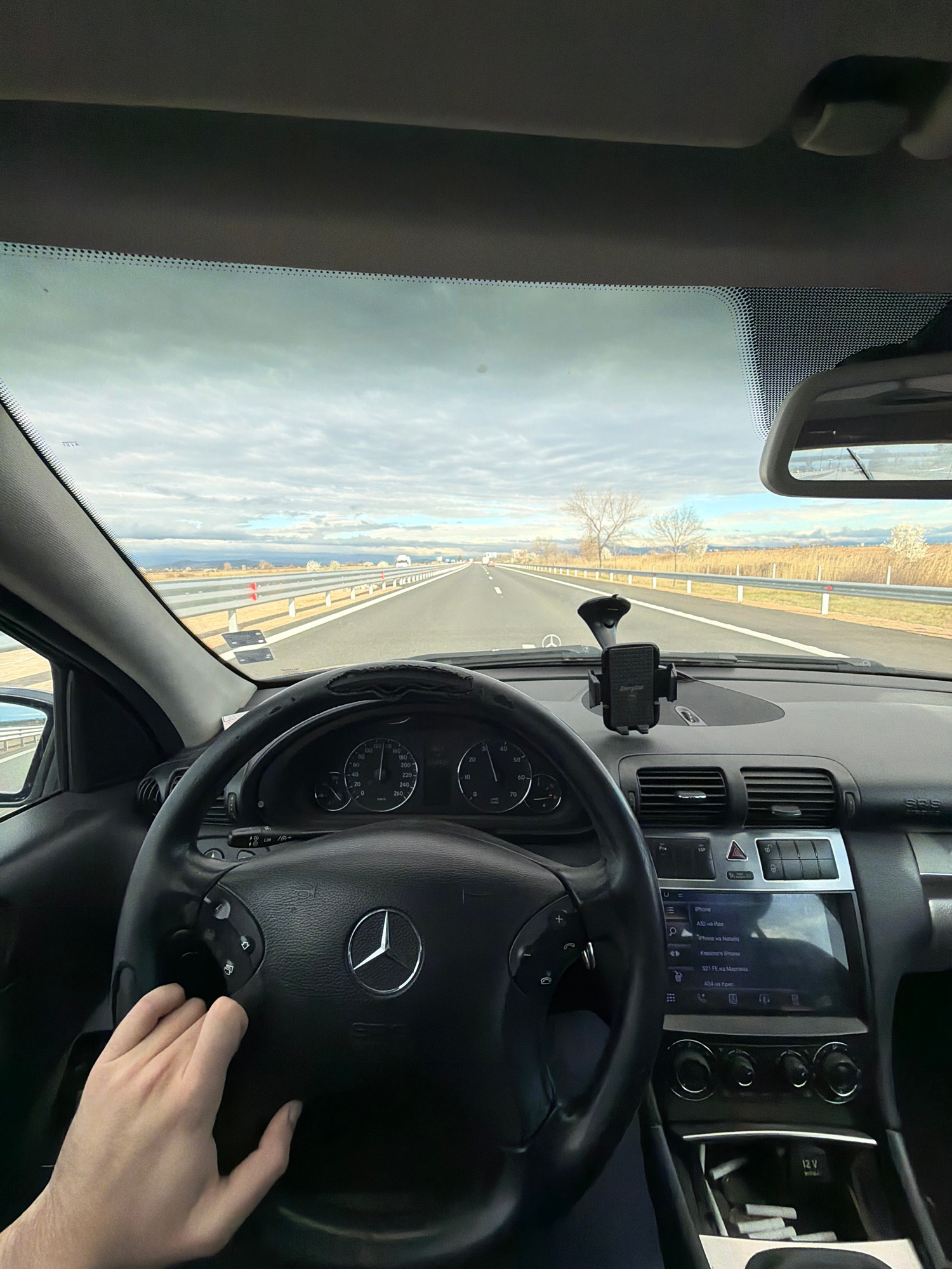 The interior of a car is depicted from the driver's perspective, with a black steering wheel prominently featuring the Mercedes-Benz logo. The driver's hand is visible on the right side of the steerin…read more