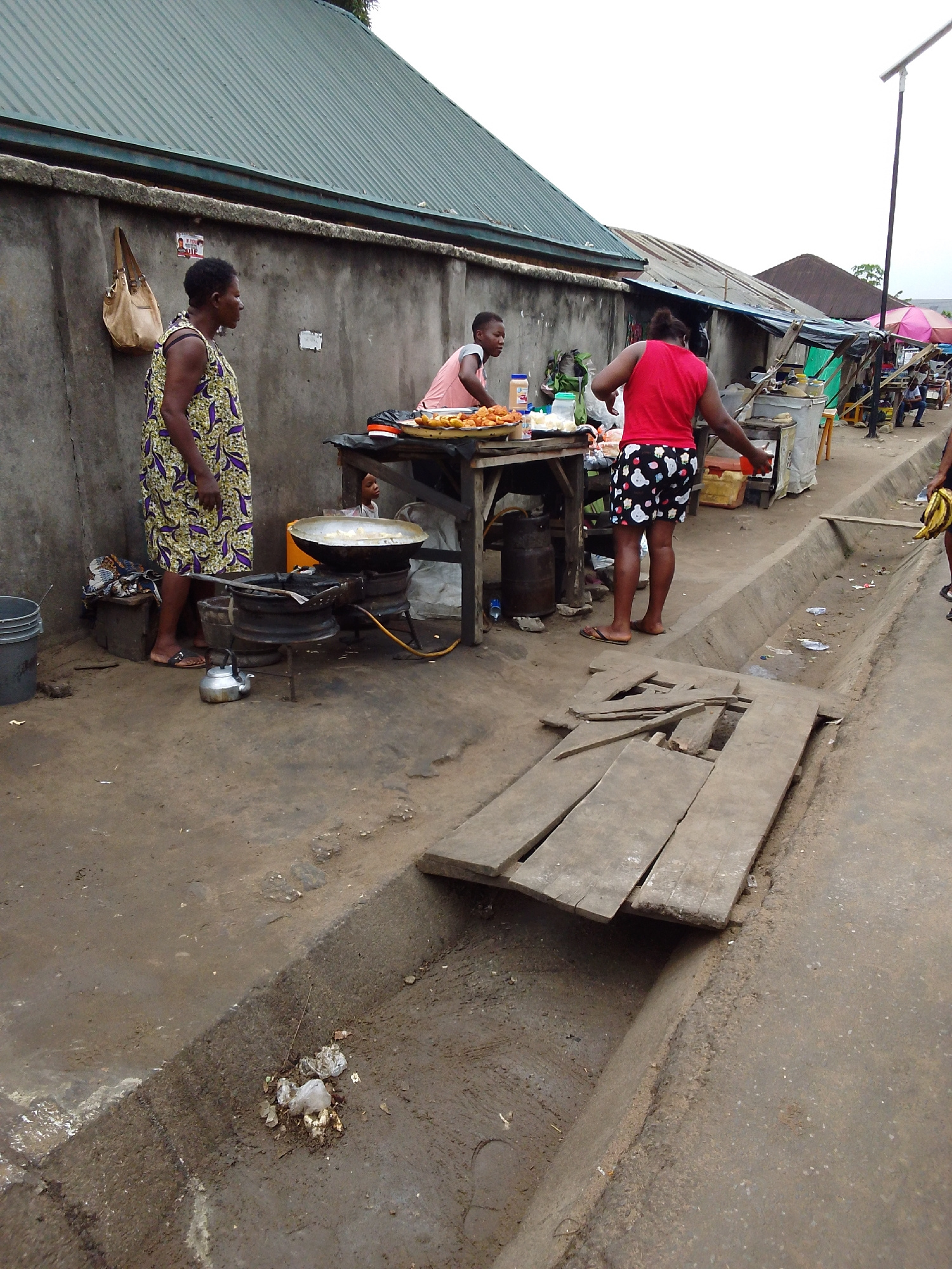 The image captures a street scene in Aba, Nigeria. Three women are visible. One woman, wearing a colorful patterned dress, stands beside a cooking station that includes a gas burner and large frying p…read more