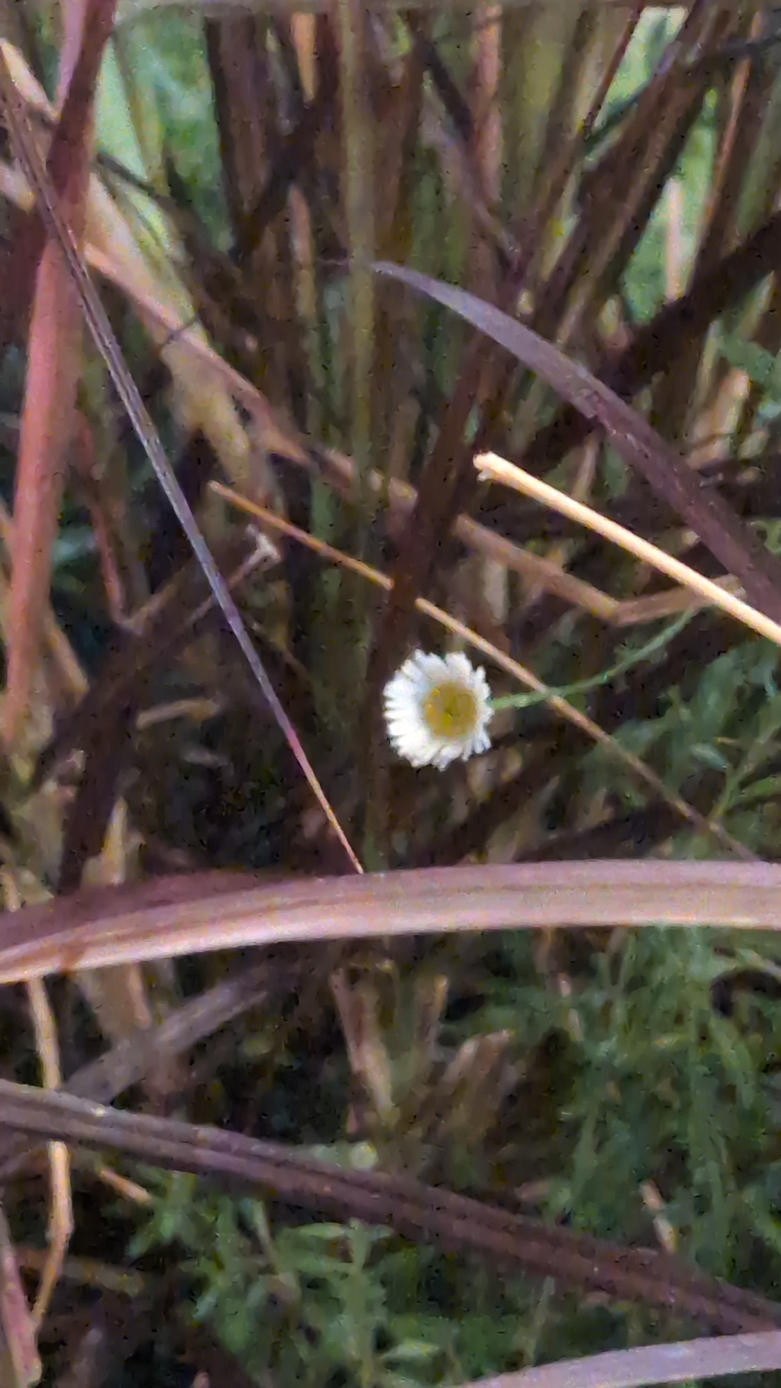 A close-up shot depicts a solitary daisy-like flower with white petals and a yellow center, suspended delicately amongst a thicket of dry, brown blades of grass or reeds. The flower droops slightly, s…read more