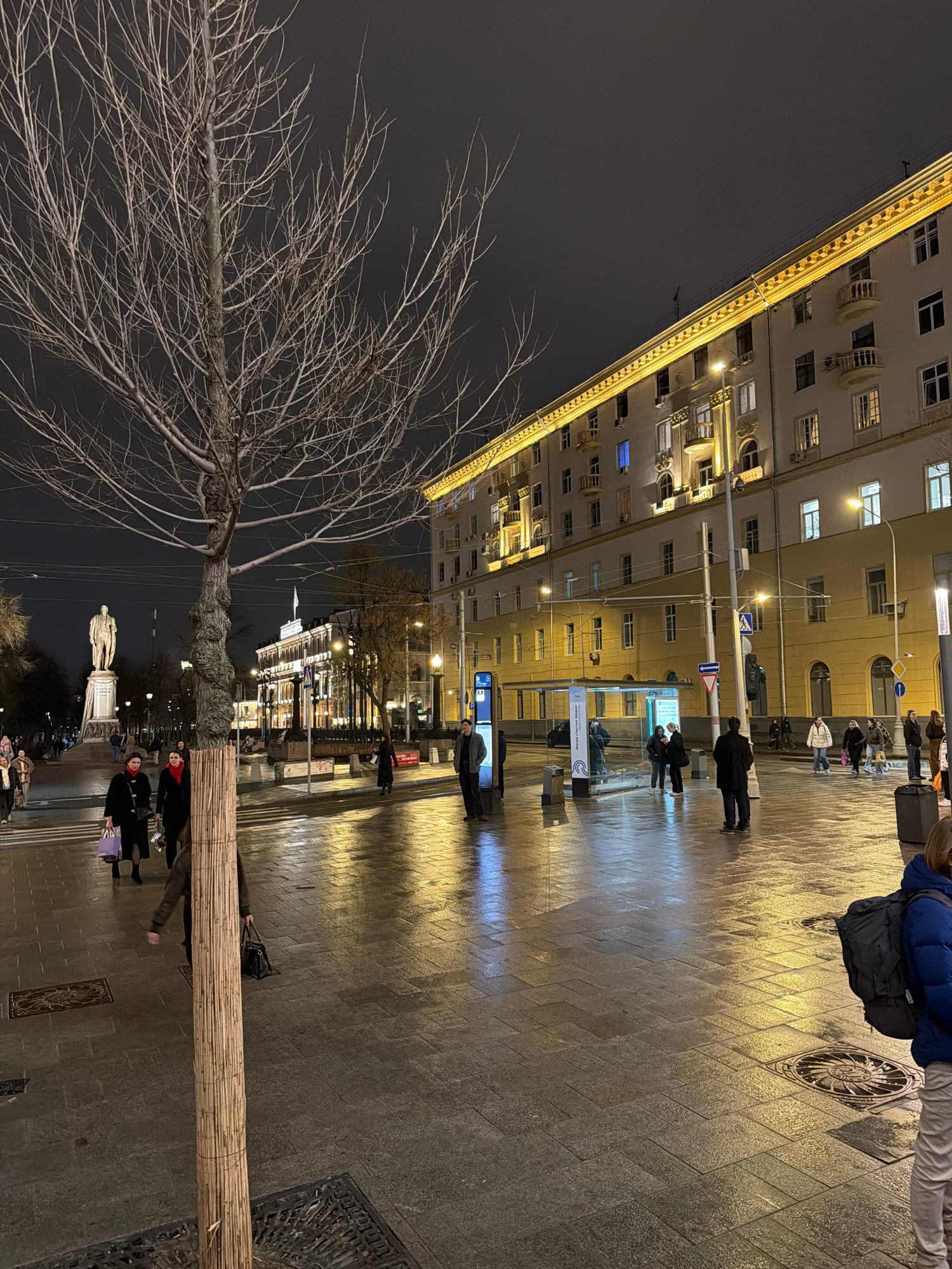 This is a nighttime view of a street in Moscow, Russia. The street is wet, reflecting the lights from the buildings and street lamps. Pedestrians are walking along the sidewalk. A bare tree is visible…read more