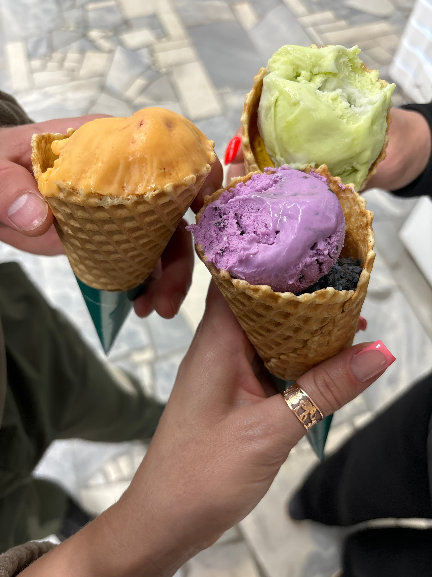 A close-up, high-angle shot captures three hands holding waffle ice cream cones indoors in Chaikovsky, Russia. Three distinct ice cream flavors are visible: a bright lime green scoop, a vibrant purple…read more