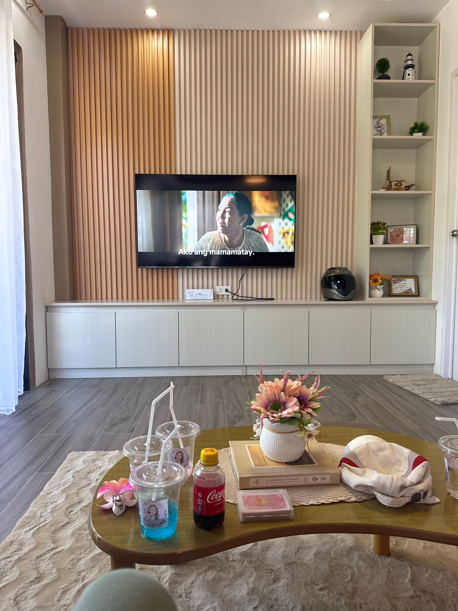 The image shows the interior of a living room in Digos, Philippines. A television is mounted on a wall with horizontal wooden paneling. Above the television are shelves displaying decorative items. To…read more