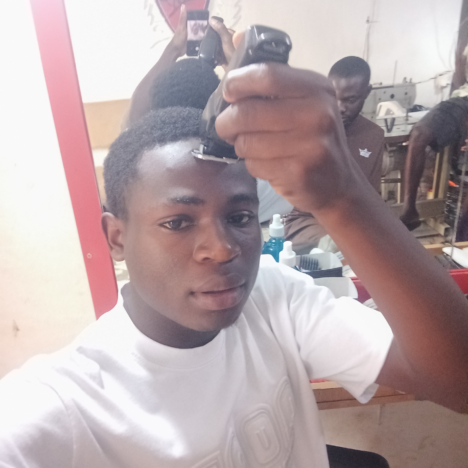 A young man is shown at close range, holding a black electric hair clipper to his forehead. He is light-skinned, wearing a white t-shirt, and looking directly at the camera. The clipper is in his righ…read more