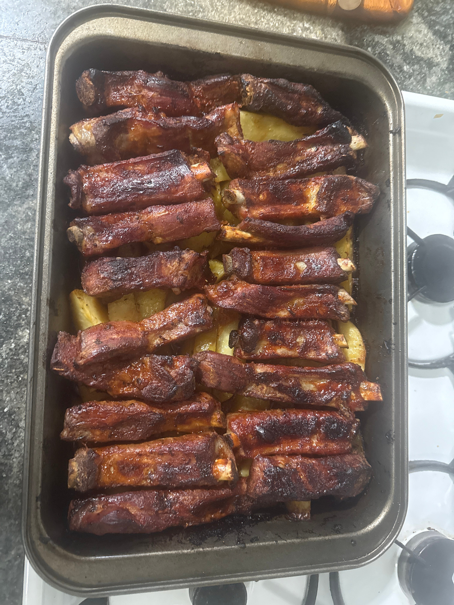 The image shows a rectangular baking tray filled with cooked ribs and potatoes. The ribs are arranged in rows, and they appear to be glazed or coated in a dark sauce. The potatoes are cut into chunks…read more