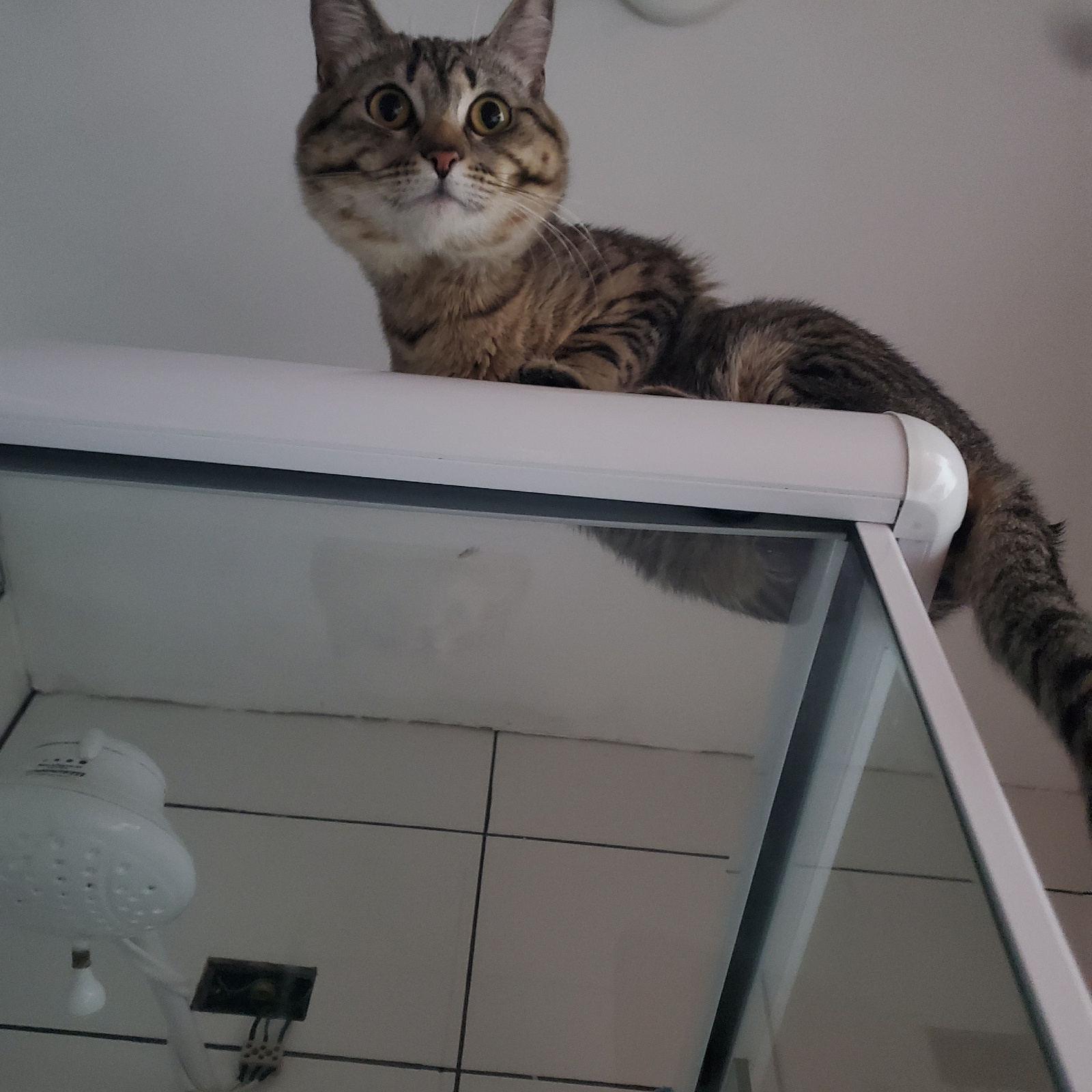 A medium shot depicts a tabby cat partially perched atop a white-framed shower enclosure. The cat's head and upper body are oriented downwards, while its tail extends towards the top right corner of t…read more