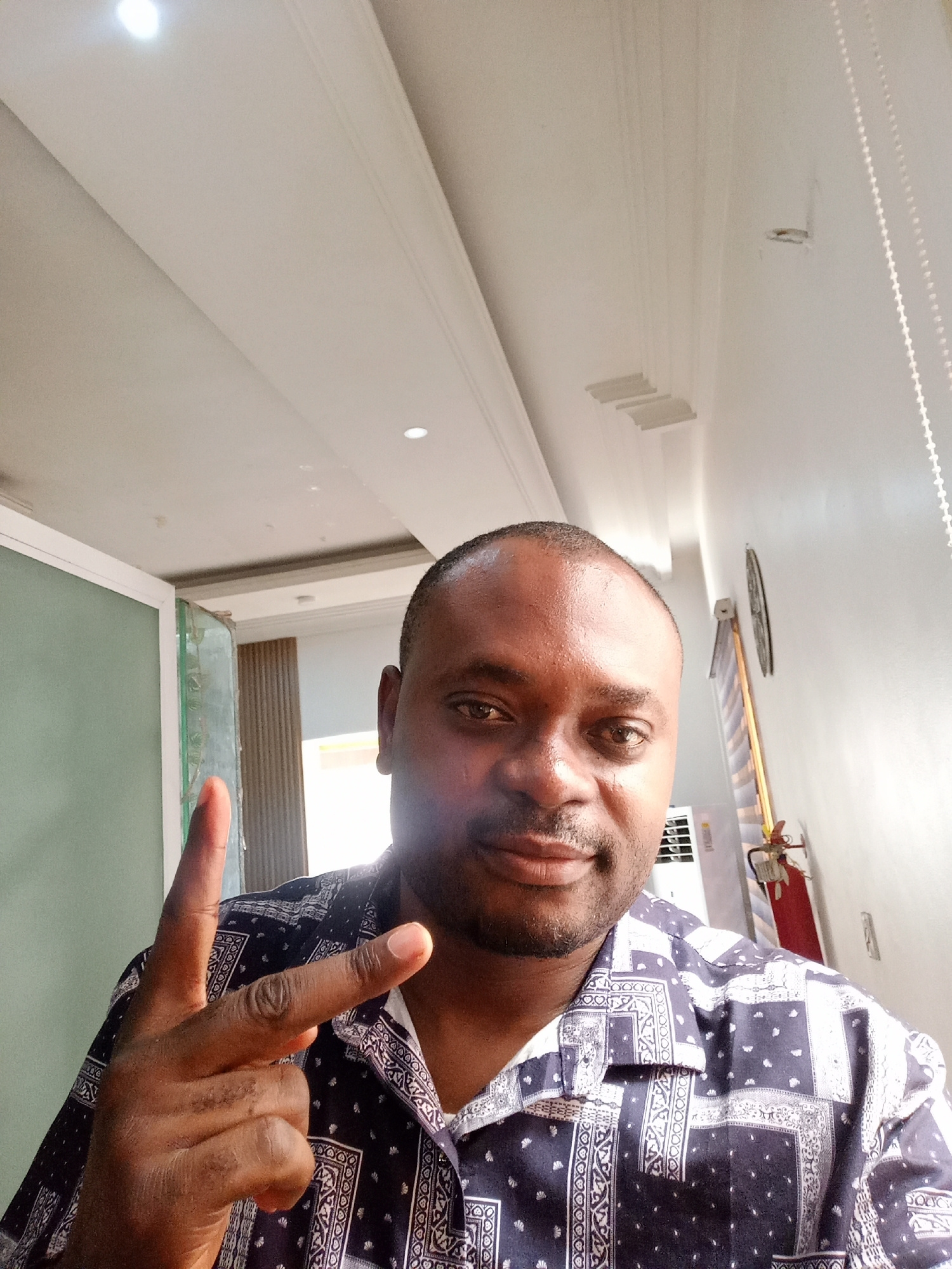 A man is taking a selfie indoors in Gwarinpa, Nigeria. The man, of African descent, is facing the camera and gesturing with his hand, holding up two fingers. He's wearing a navy blue button-down shirt…read more