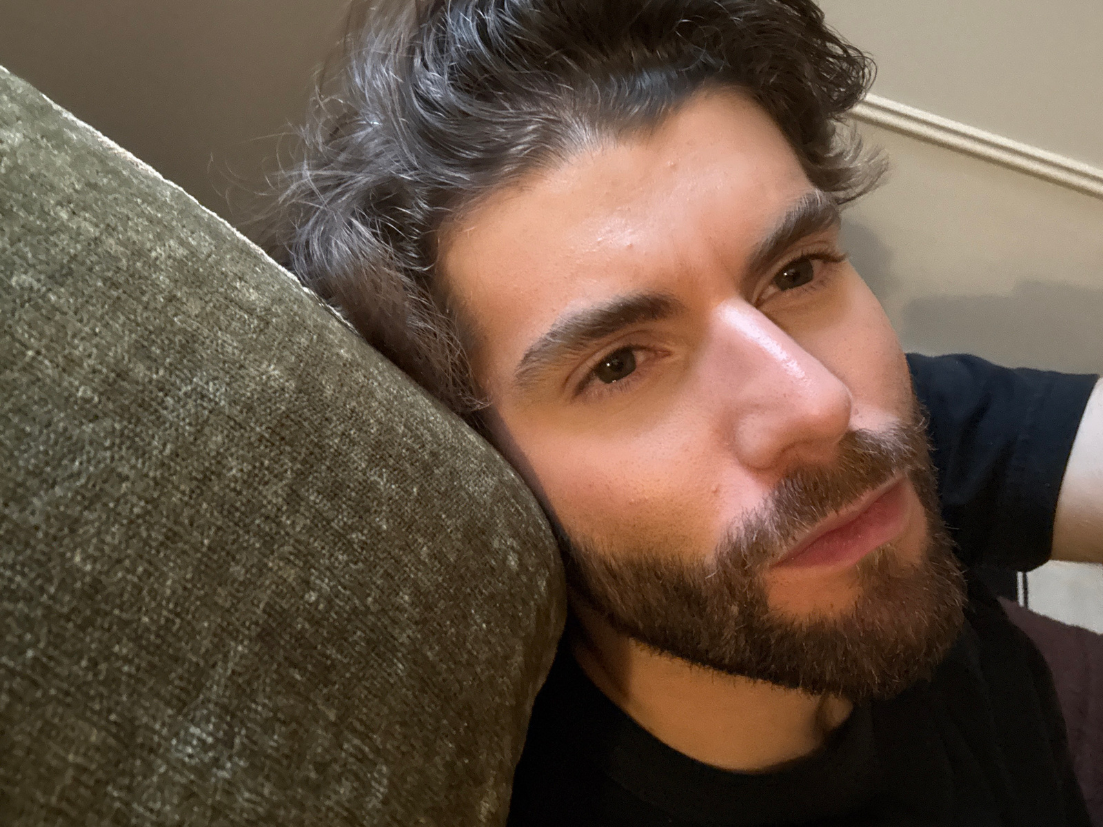 A close-up indoor shot features a man with dark, wavy hair and a beard, resting his head on an olive-green textured cushion. He is wearing a black shirt. A light-colored wall and molding are visible iā¦read more