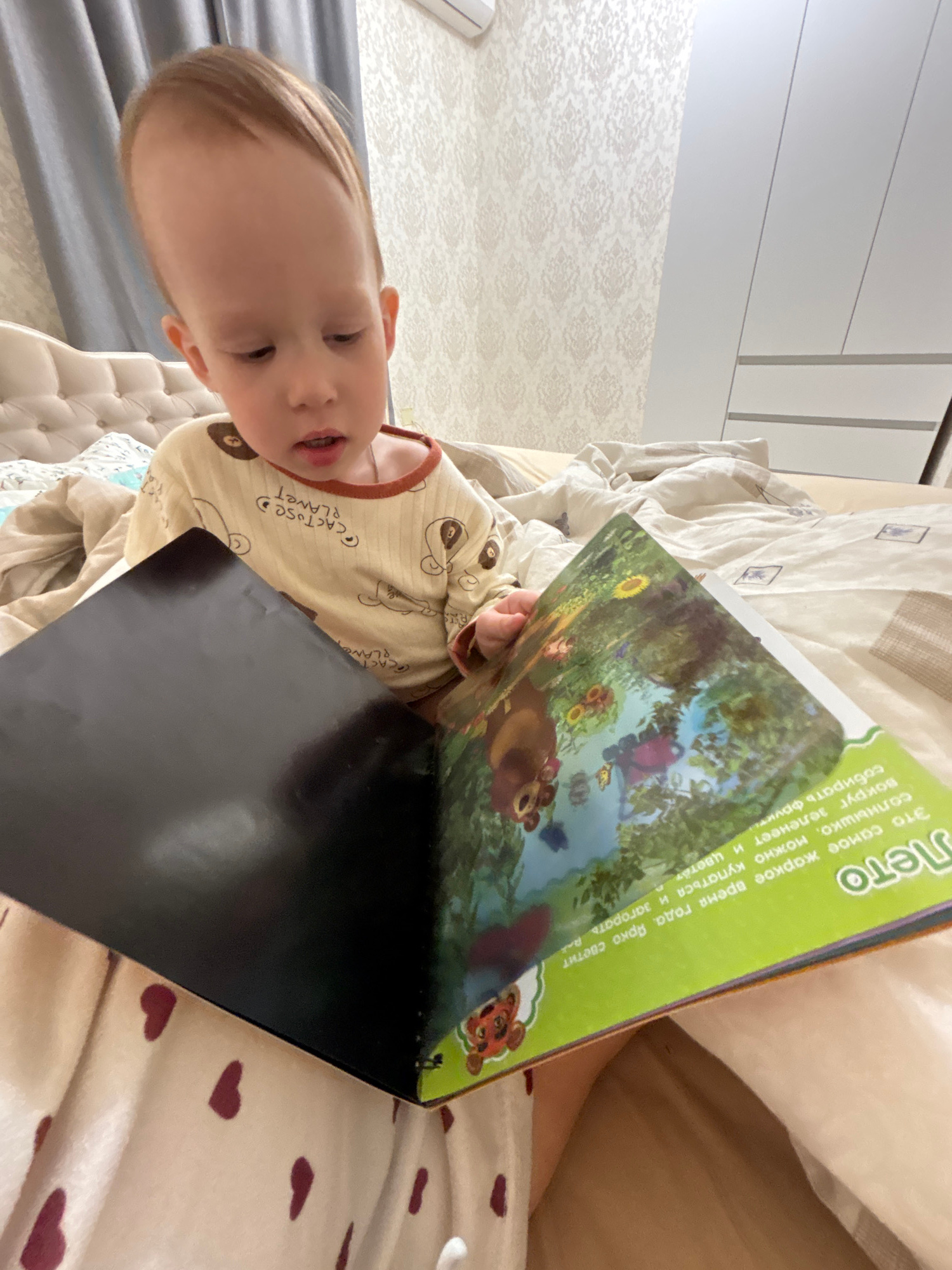 A child is lying on a bed, appearing to read a book with a green cover and illustrations of a bear and greenery. The cover text is in Russian. The child is wearing a beige long-sleeved shirt with cart…read more