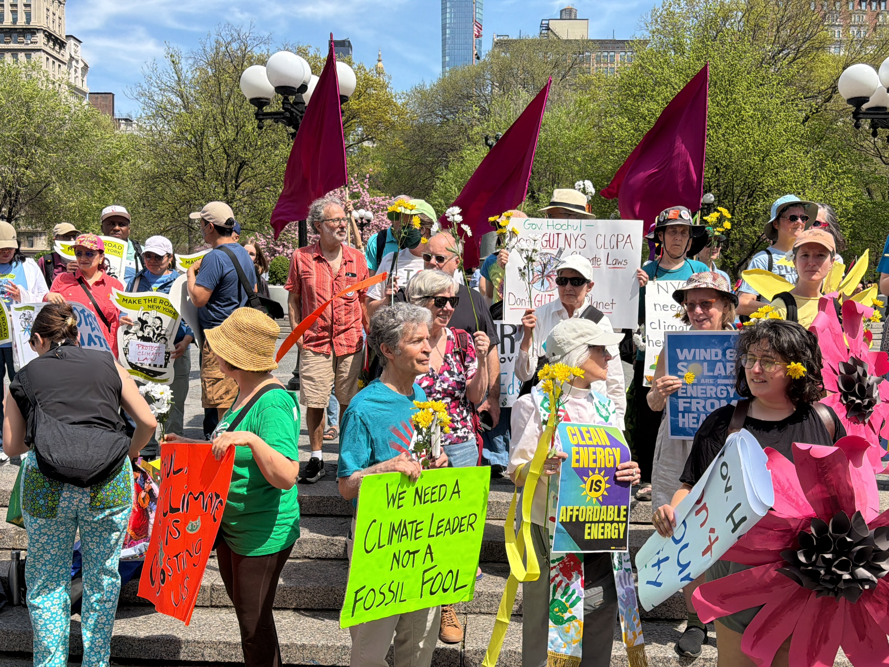 A vibrant outdoor gathering, likely a climate protest or rally, is captured on a sunny day in what appears to be a park or public square in New York, United States. A diverse group of people, many app…read more
