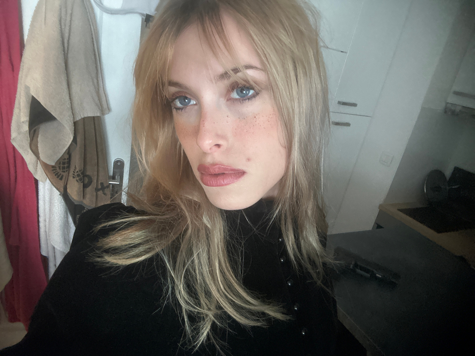 A selfie of a young, light-skinned person with blonde hair and blue eyes, likely taken indoors. The person is wearing a black top. The background includes white cabinets, a dark countertop, and hangin…read more