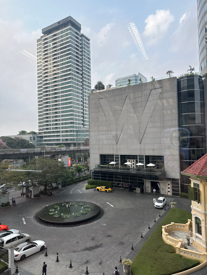 An elevated perspective displays modern architecture, including a tall, striated building reflected in glass. A gray building with geometric patterns dominates the view. A roundabout features parked c…read more