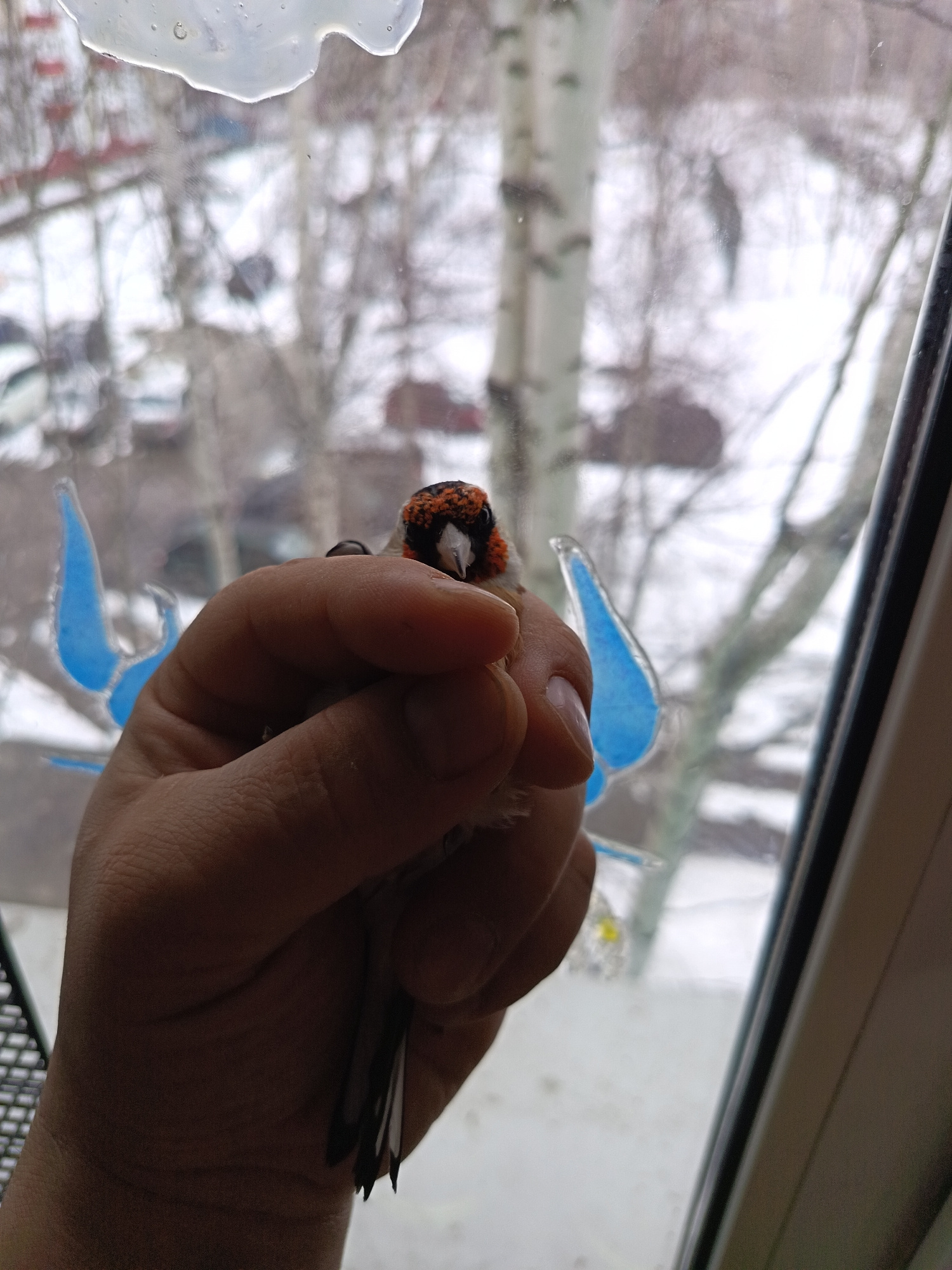 A person is holding a goldfinch in their hand. The bird has a red face, black and white head, and brown back. The bird's tail feathers are visible. In the background is a window, and through the windo…read more