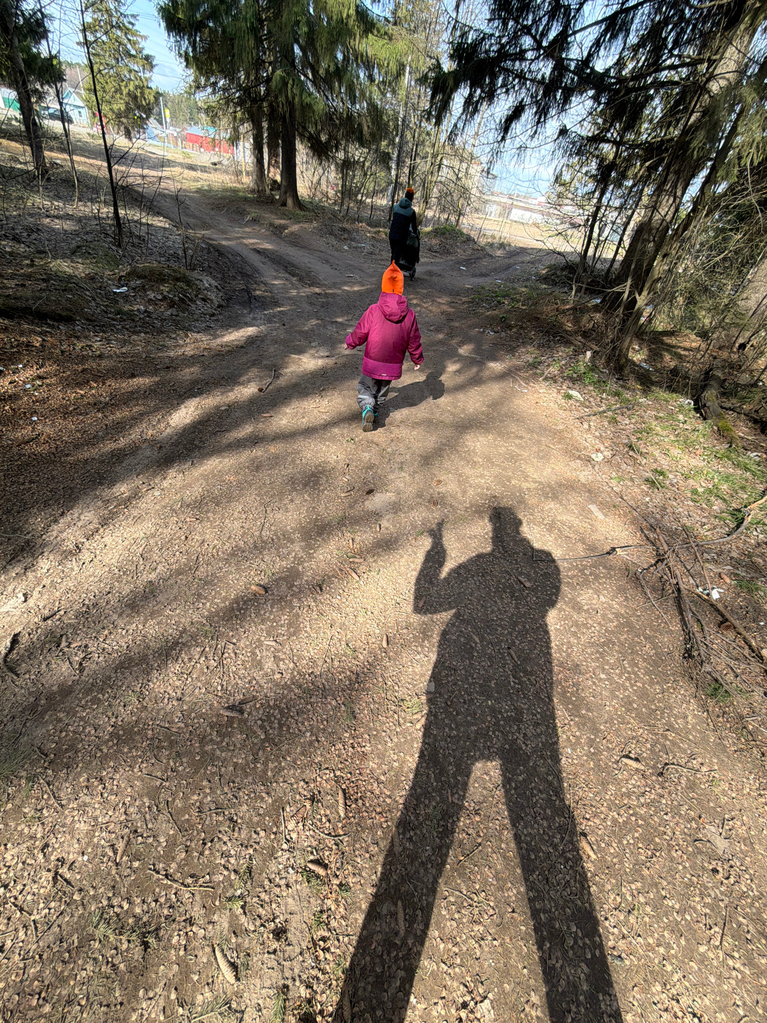 The image depicts a person, possibly a child, wearing a pink jacket and an orange hat, walking along a dirt path in a park in Chaikovsky, Russia. Another person, wearing a black jacket, is walking beh…read more