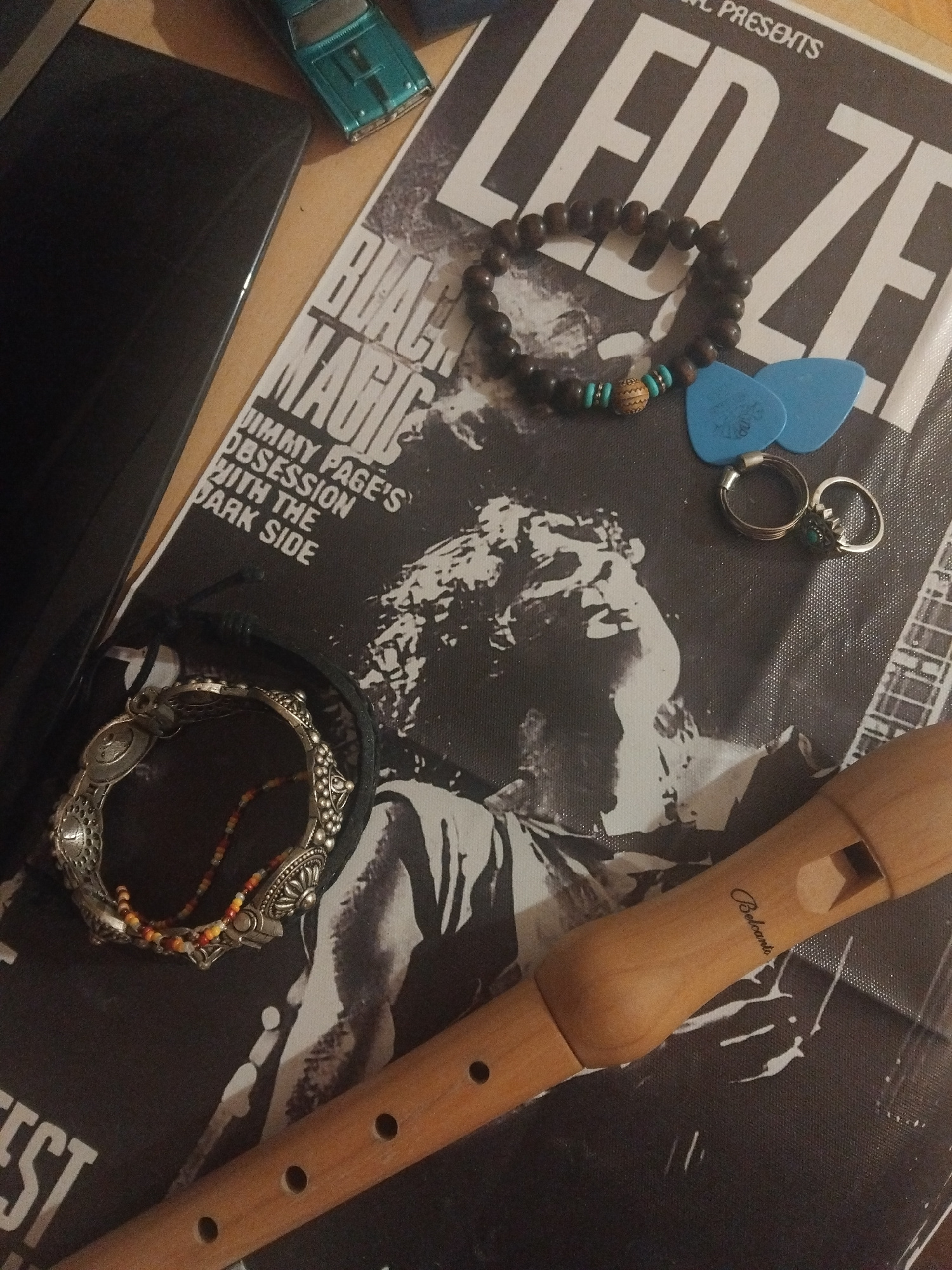 The image shows a collection of items arranged on a surface with a Led Zeppelin promotional poster as the backdrop. Two blue guitar picks, two rings (one with a turquoise stone), a wooden beaded brace…read more