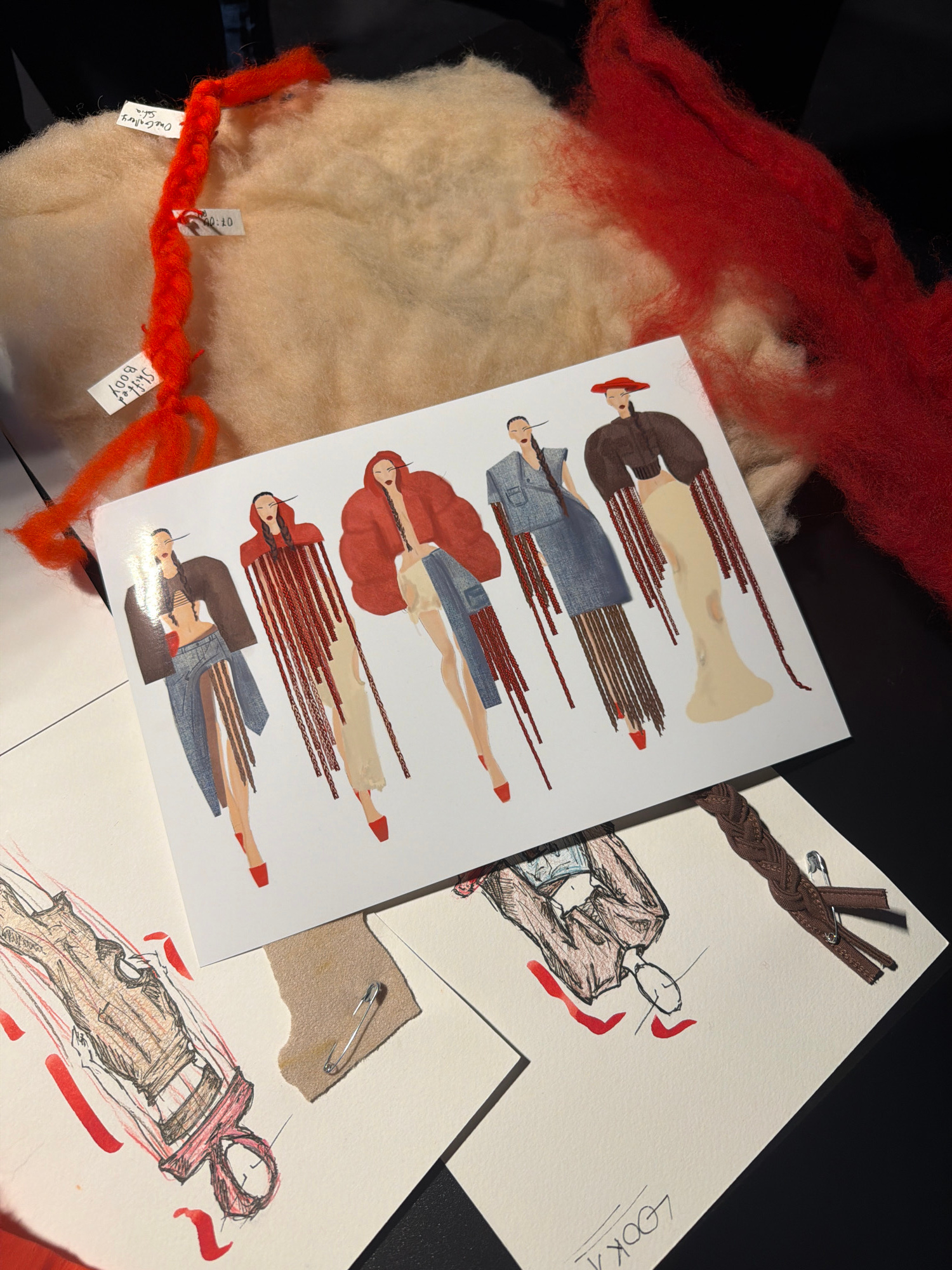 The image depicts a collection of fashion-related materials arranged on a surface. There is a printed card featuring illustrations of figures wearing clothing designs, with long braided extensions. Th…read more