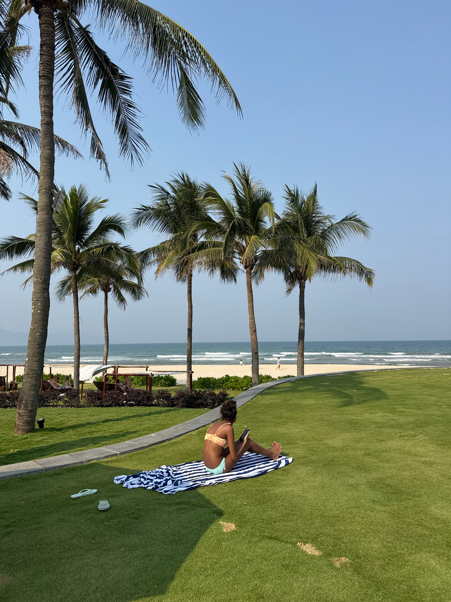 A woman is sitting on a striped beach towel on a grassy lawn in Đà Nẵng, Vietnam. She is wearing a bikini and using her phone. Palm trees are in the background, with the beach and ocean visible beyond…read more