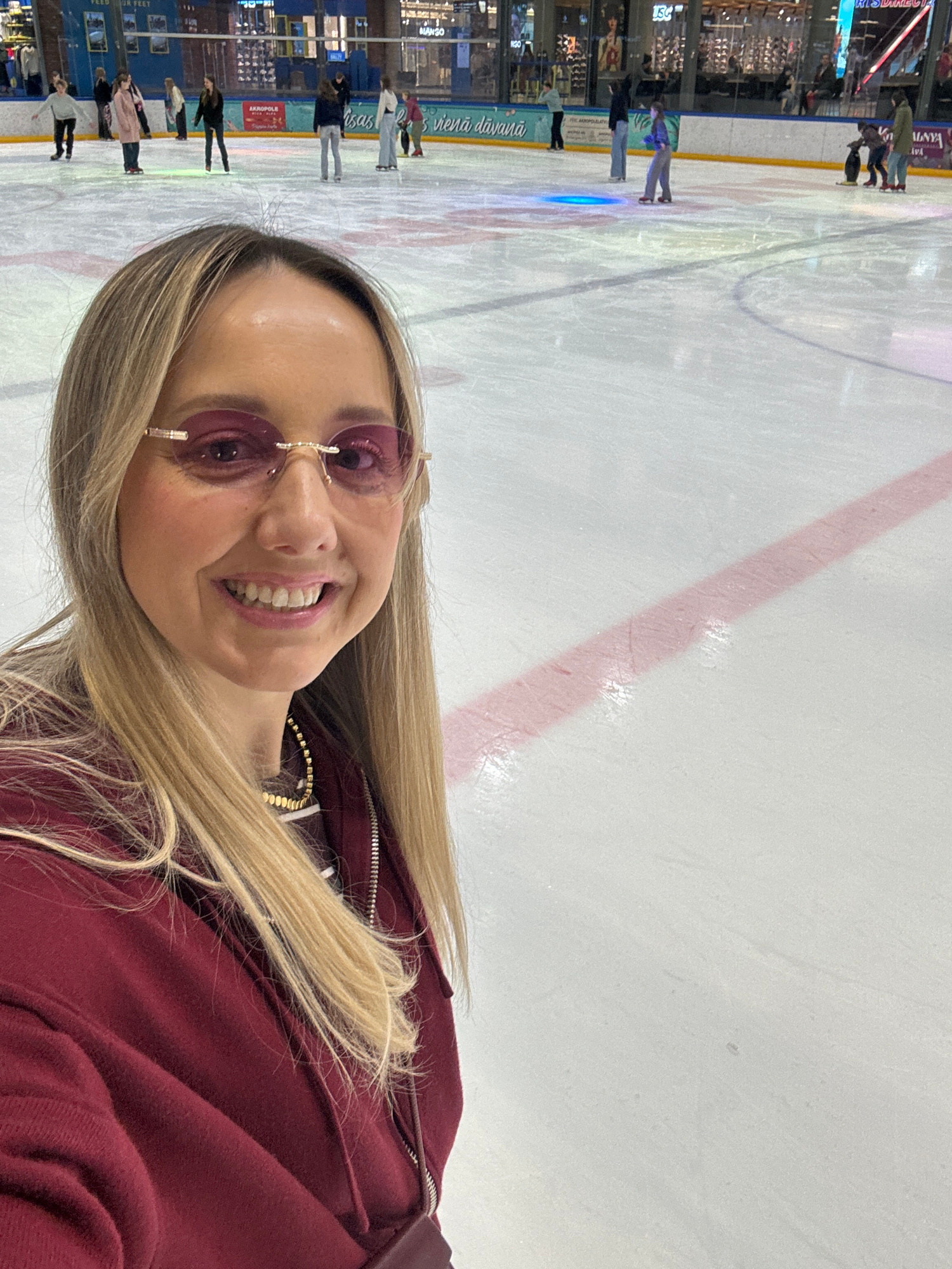 A fair-skinned woman with blonde hair, wearing pink-tinted sunglasses and a maroon zippered hoodie, smiles into the camera. She is on an ice rink with other people ice skating in the background. The l…read more