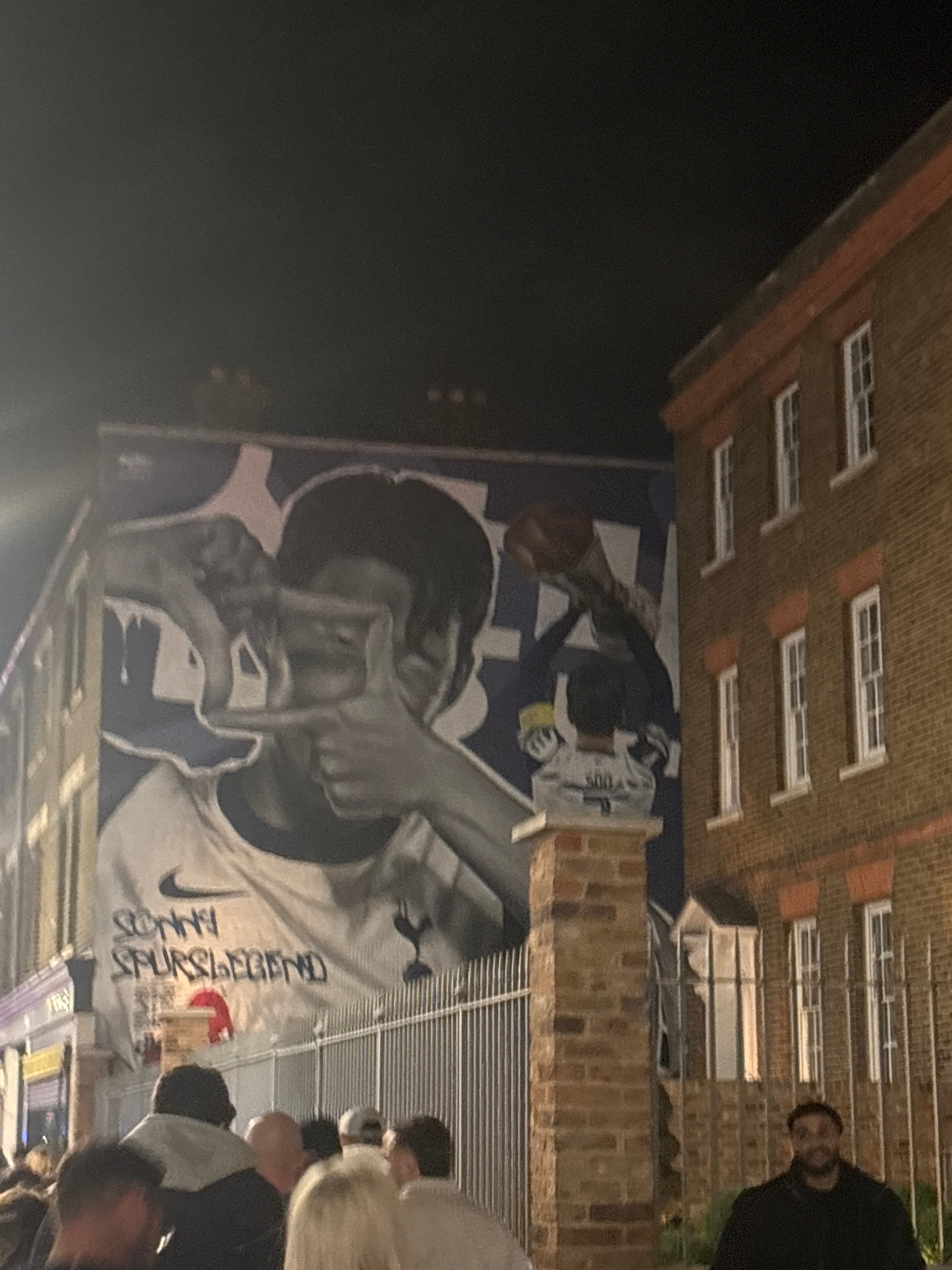A mural depicting a person with text is on the side of a brick building. The text on the mural reads, "Sonny Spurs Legend." The location appears to be in London, United Kingdom. People are standing ar…read more