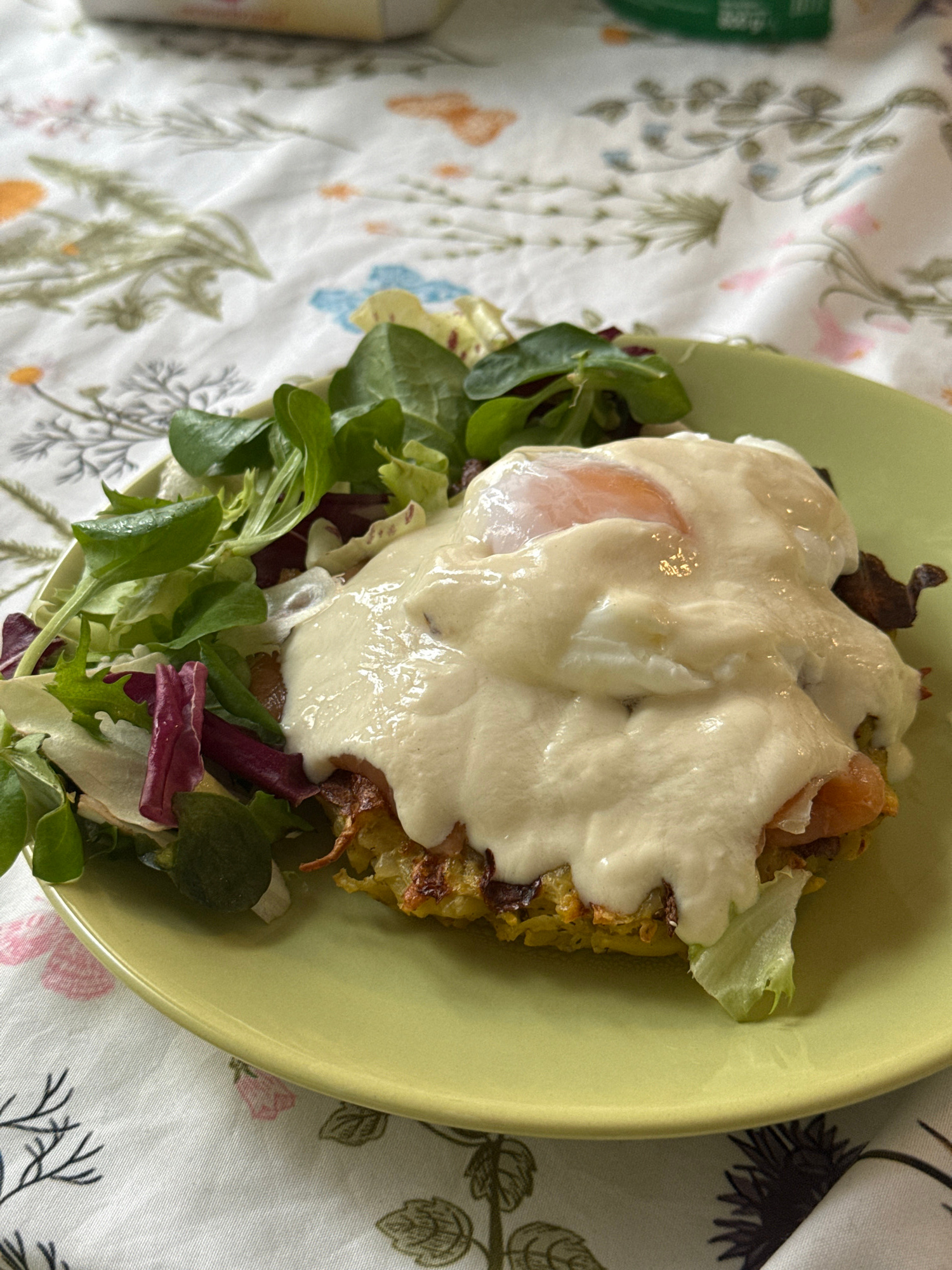 A close-up shot of a meal presented on a light green plate placed on a tablecloth with a floral design. The meal consists of what appears to be a potato cake or rosti, topped with a pale white sauce a…read more
