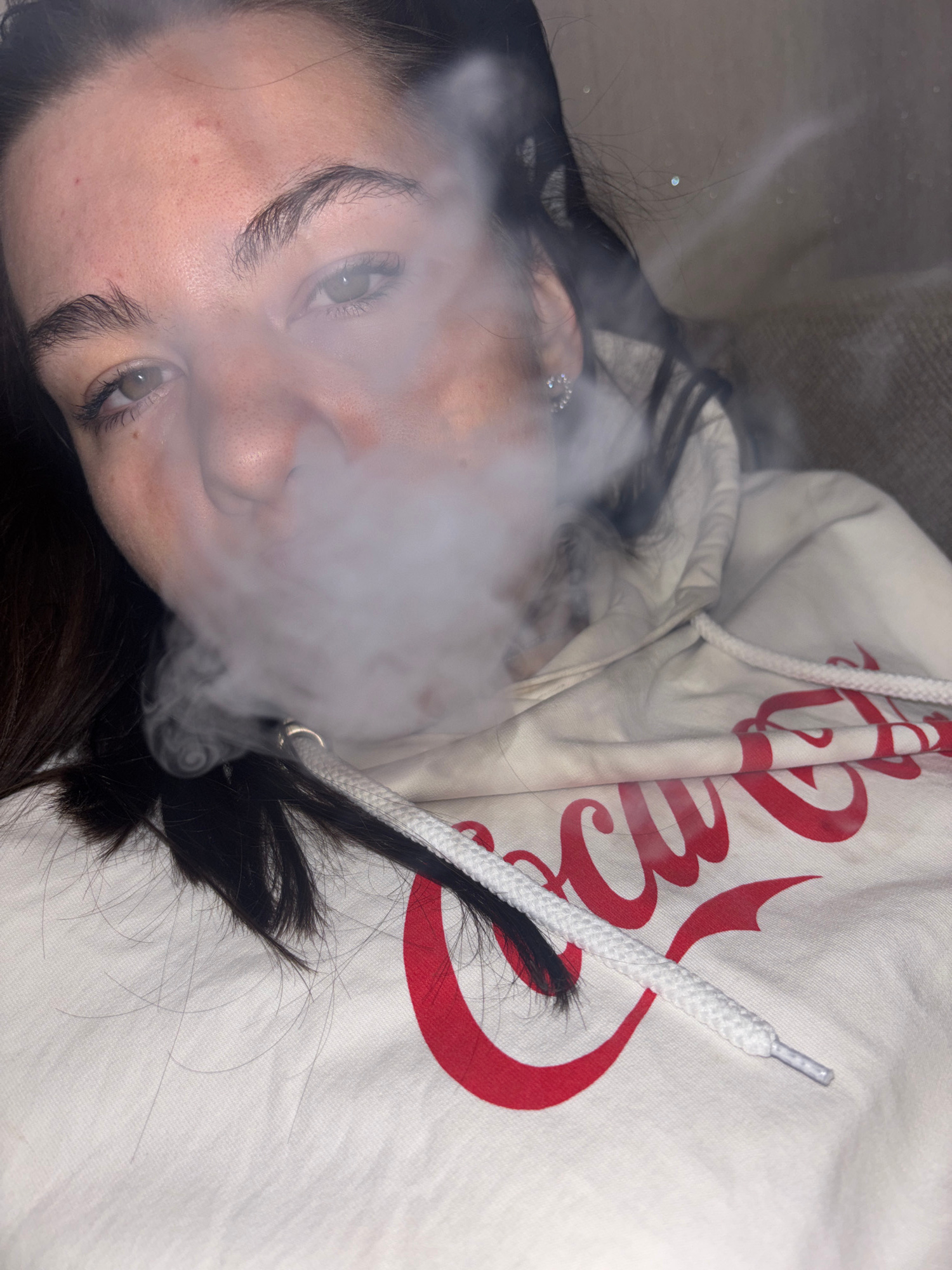 A woman with dark hair is lying down wearing a light-colored hooded sweatshirt with red lettering. She is exhaling a cloud of vapor or smoke. She has fair skin and visible eyebrows and eyelashes. An e…read more