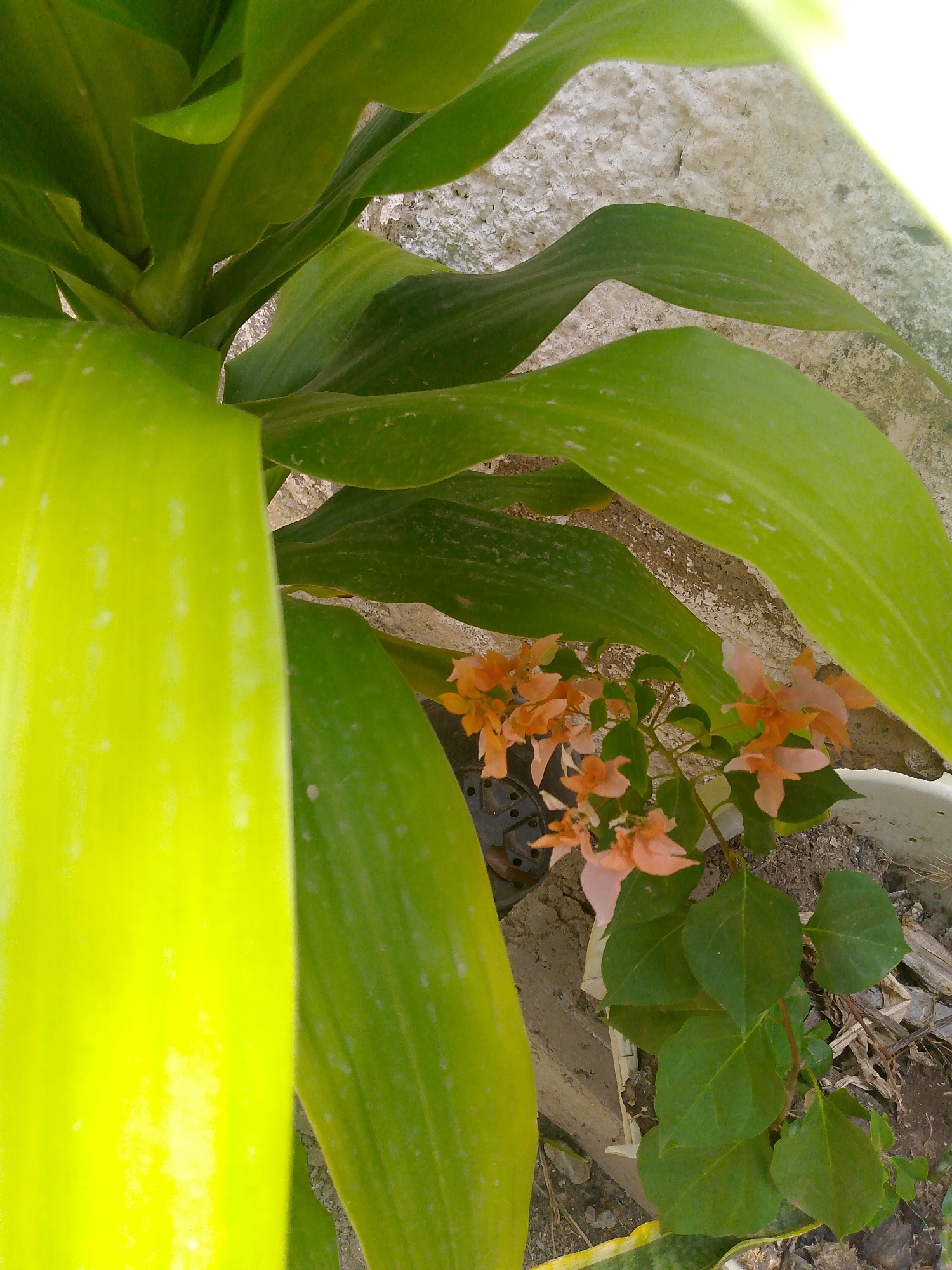 A ground-level shot captures a plant arrangement. Dominating the left is a large, bright yellow plant leaf, likely from a type of corn plant. Behind this, a leafy green plant with speckled leaves curv…read more