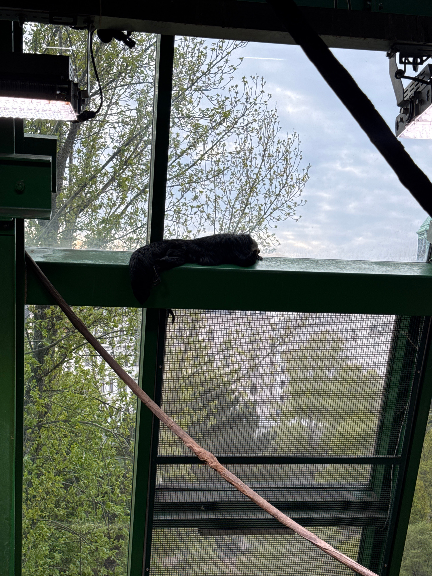 The image shows a view from inside a metal structure, possibly an observation deck or enclosure, with a view of trees and sky outside. A dark, elongated object is attached to the green metal vertical…read more