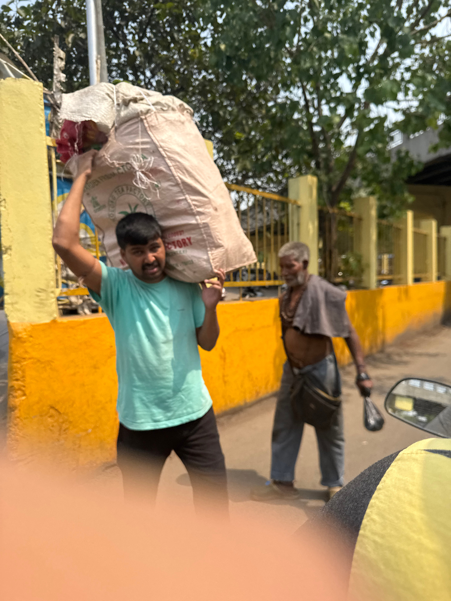 A young man carries a large sack on his shoulder in Kolkata, India. He wears a light blue t-shirt and black pants. An elderly man with bare torso and grey hair is walking alongside a building on the right. The background shows an urban environment with trees and buildings. | Open Wire