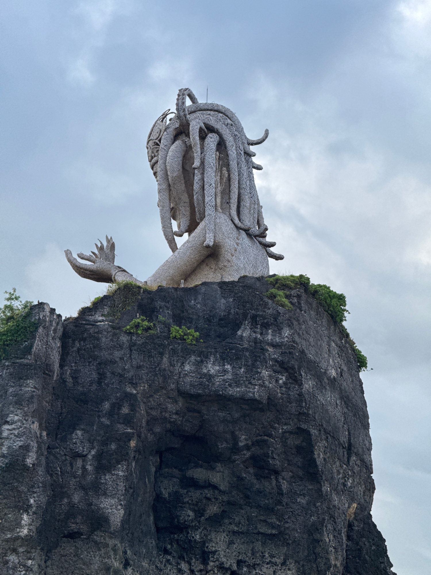 A low-angle shot depicts a statue positioned on the edge of a cliff against a cloudy sky. The statue appears to be of a mythical figure, possibly a Medusa-like character, with snake-like strands as ha…read more