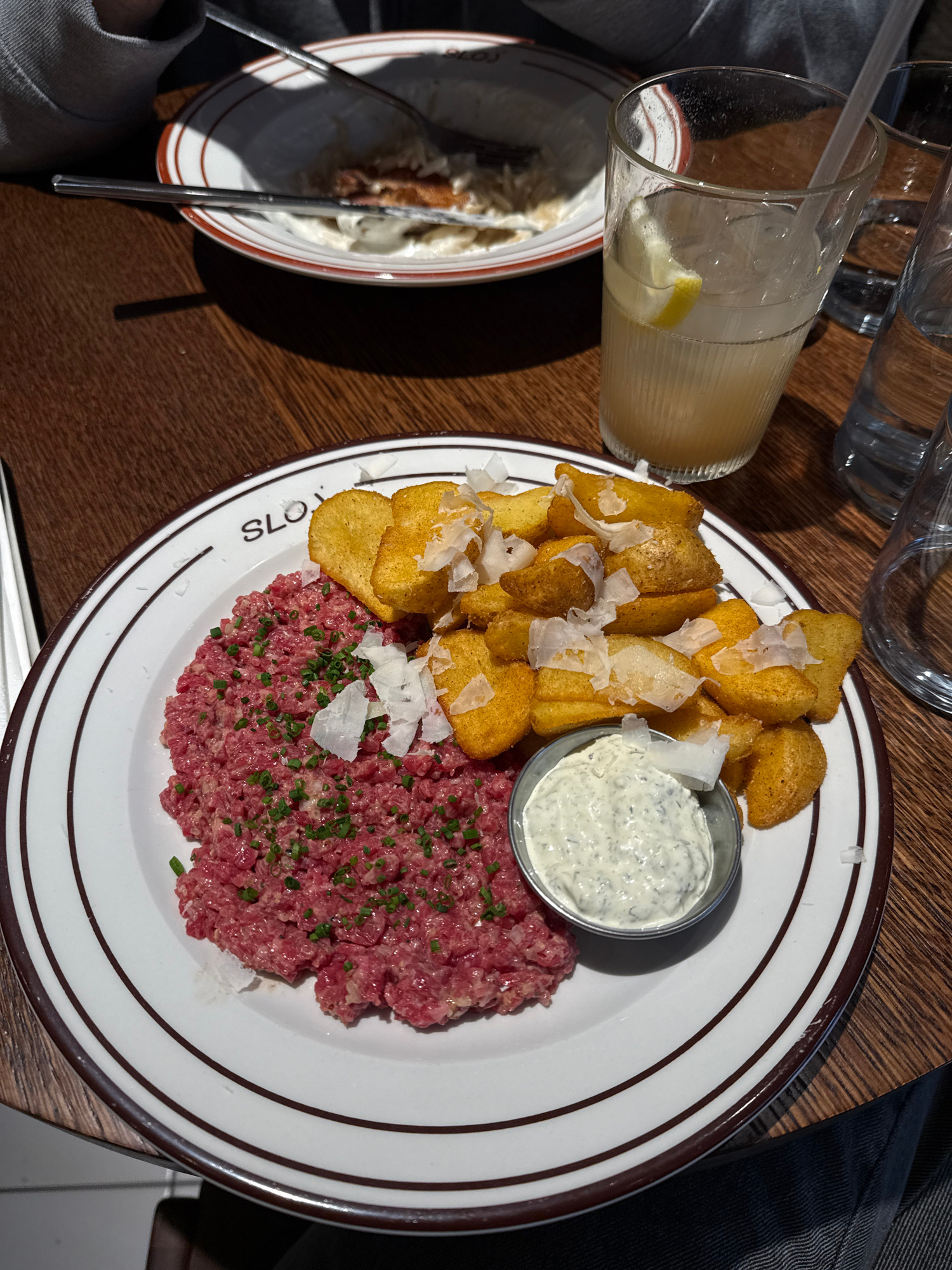 The image displays a close-up, overhead view of a meal served at a restaurant in Belgrade, Serbia, identifiable by the partial "SLO" branding on the main plate, consistent with "Slovenija" restaurant. The scene focuses on a round white plate with a brown double-line rim, placed on a dark brown wooden table. The main dish on the plate consists of three distinct components: a mound of raw, finely ground red meat, likely beef tartare, garnished with chopped green chives on the left side; a pile of golden-brown potato wedges or robust chips on the right, topped with thin shavings of white cheese; and a small, silver metal ramekin centrally placed at the bottom, containing a creamy white sauce with visible green specks, resembling tartar sauce. In the upper right portion of the frame, a tall, clear glass with a ribbed texture holds a pale yellow beverage with ice cubes, a lemon wedge, and a clear straw. Another clear glass, likely containing water, is partially visible to the right of the first glass. In the upper left background, a partially consumed meal on a white plate with a brown rim is visible, appearing to contain a white creamy base with a piece of brown food and a metal fork or spoon resting within. A person's grey sleeve is partially visible next to this plate. The lower right edge of the frame shows a partial view of what appears to be a person's blue-grey denim-clad leg or lap. The overall lighting suggests an indoor setting, possibly with natural light from a nearby window or strong artificial illumination. | Open Wire
