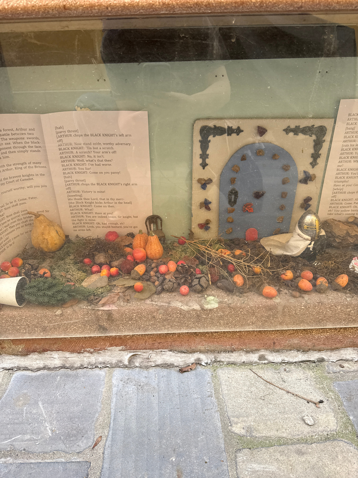 A diorama depicting a scene from Monty Python and the Holy Grail featuring the Black Knight encounter. The diorama is enclosed in a glass case with a brown frame. The background consists of a printed…read more