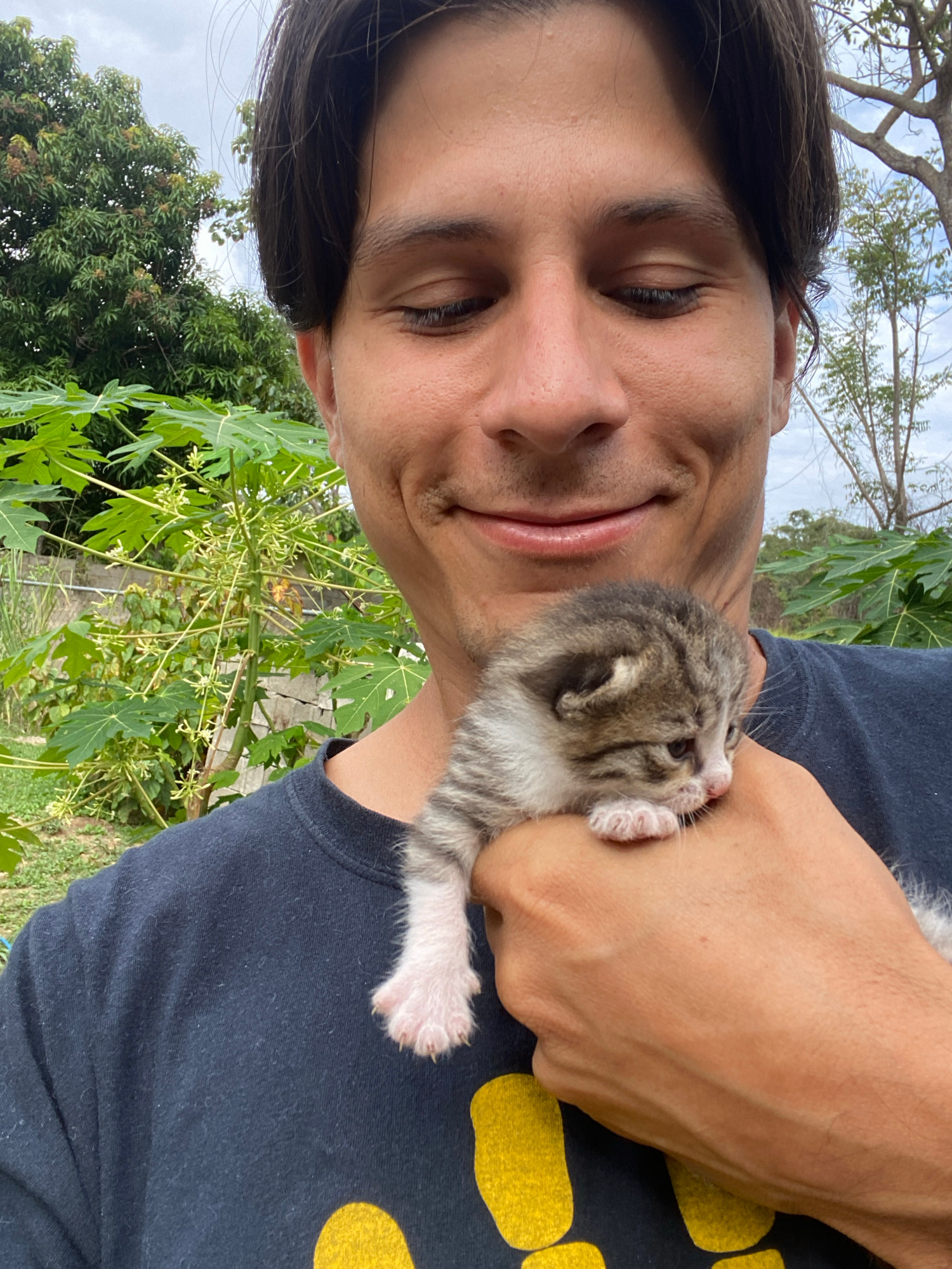 A medium-shot selfie shows a person holding a kitten outdoors. The person, likely male, has brown hair, tan skin, and is smiling slightly. The kitten, predominantly gray and white with tabby markings,…read more