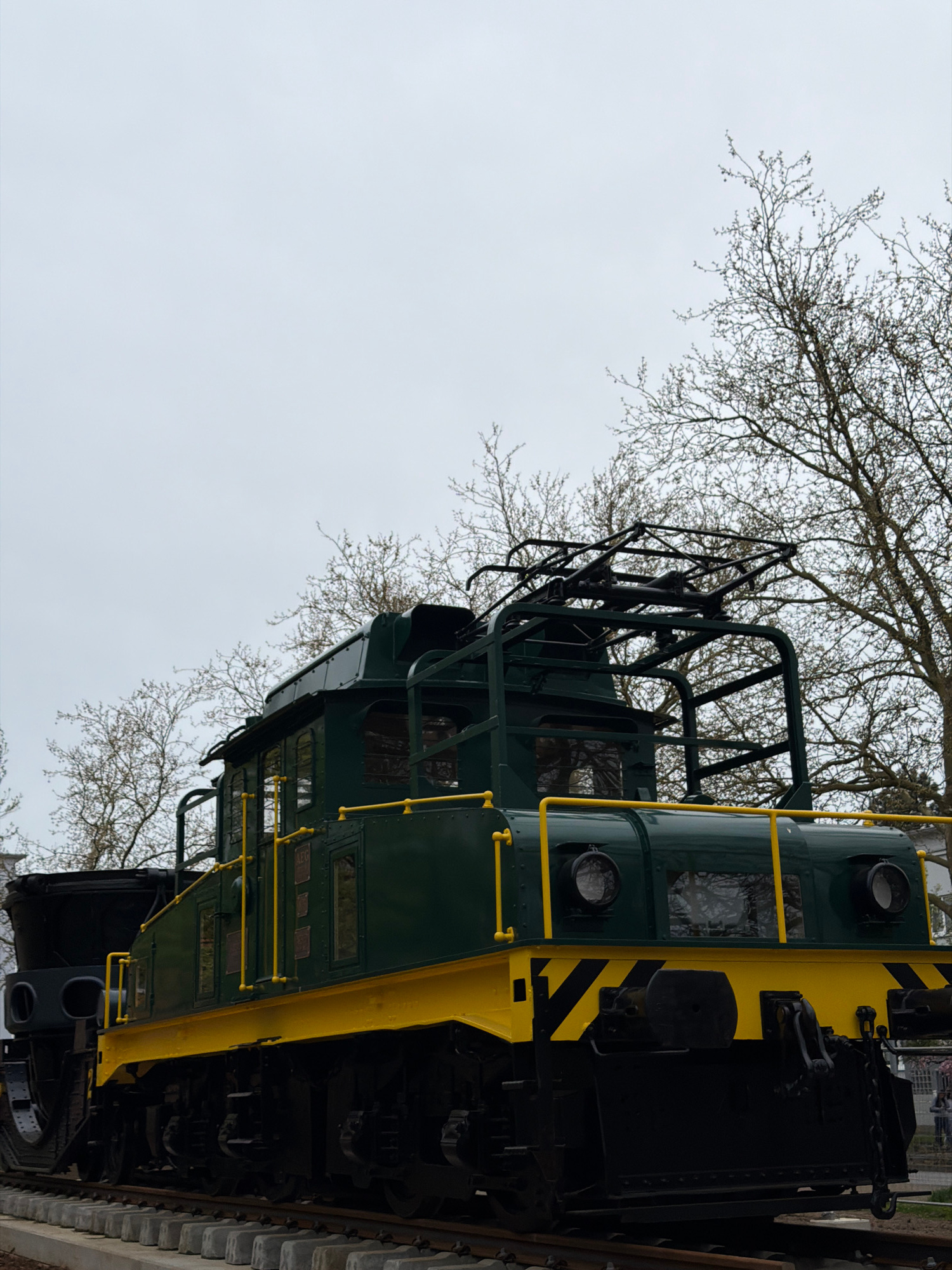 The image shows the side of a green and yellow diesel locomotive displayed in Esch-sur-Alzette, Luxembourg. The locomotive features a prominent superstructure, a black frame, and visible railroad trac…read more