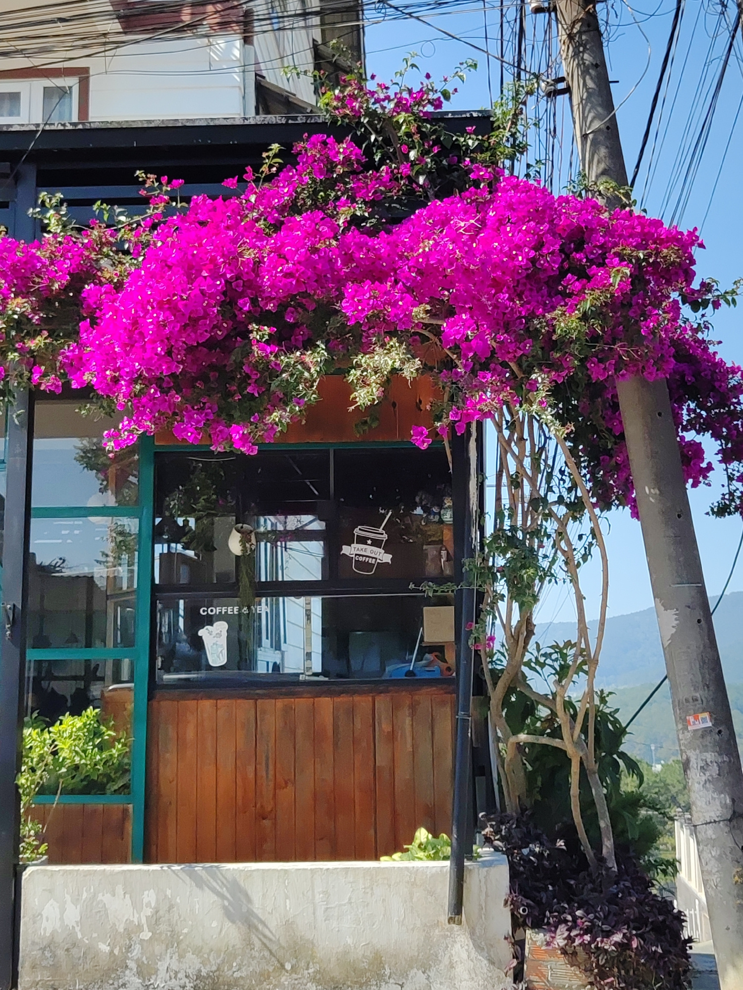 A street-level, daytime shot depicts a small café or shop in Da Lat, Vietnam. The shop is enclosed by large windows in black frames with teal accents, atop a wood-paneled base. The windows feature sig…read more