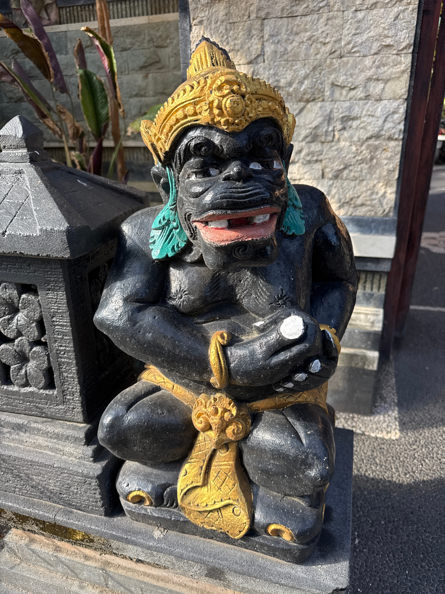 The image shows a statue in Kuta, Indonesia. The statue is dark gray with gold accents and features a figure with an open mouth, green accents around the neck, and a golden headpiece. The statue is pl…read more